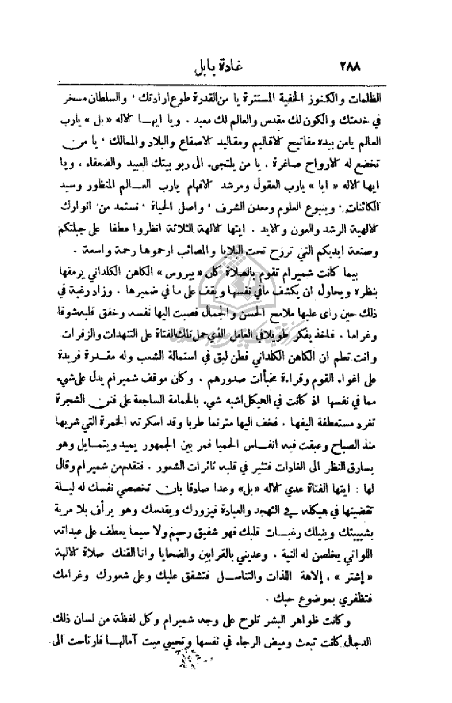 الساجعة على فنن الشجرة تغرد مستعطفة أليفها. فحف إليها مترنما طريا وقد أسكرته الخمرة التي شربها منذ الصباح وعبقت فيه أنفاس الحميا فمر بين الجمهور يميد ويتمايل وهو يسارق النظر إلى الغادات فتثير في قلبه ثائرات الشعور. فتقدم من شميرام وقال لها: أيتها الفتاة عدي الإله (بل) وعدا صادقا بأن تخصصي نفسك له ليلة تقضينها في هيكله في التهجد والعبادة فيزورك ويقدسك وهو يرأف بلا مرية بشيبتك وينيلك رغبات قلبك فهو شفيق رحيم ولا سيما يعطف على عبداته اللواتي يخلصن له النية. وعديني بالقرابين والضحايا وأنا ألقنك صلاة الآلهة (إشتر) إلاهة اللذات والتناسل فتشفق عليك وعلى شعورك وغرامك فتظفري بموضوع حبك.