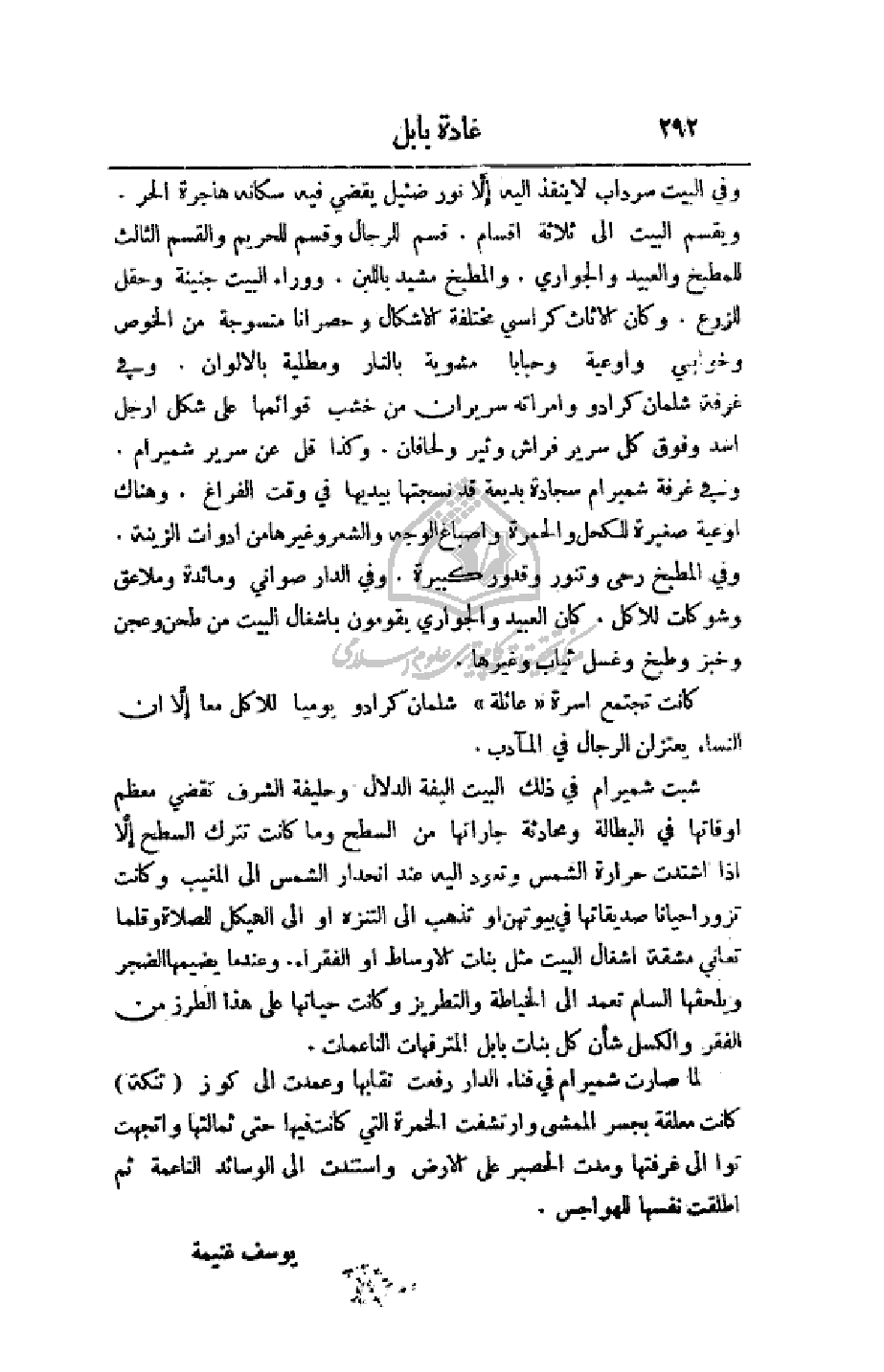 شبت شميرام في ذلك البيت أليفة الدلال وحليفة الشرف تقضي معظم أوقاتها في البطالة ومحادثة جاراتها من السطح وما كانت تترك السطح إلا إذا اشتدت حرارة الشمس وتعود إليه عند الشمس إلى المغيب وكانت تزور أحيانا صديقاتها في بيوتهن أو تذهب إلى التنزه أو إلى الهيكل للصلاة وقلما تعاني مشقة أشغال البيت مثل بنات الأوساط أو الفقراء. وعندما يضيمها الضجر ويلحقها السأم تعمد إلى الخياطة والتطريز وكانت حياتها على هذا الطرز من الفقر والكسل شأن كل بنات بابل المترفهات الناعمات.