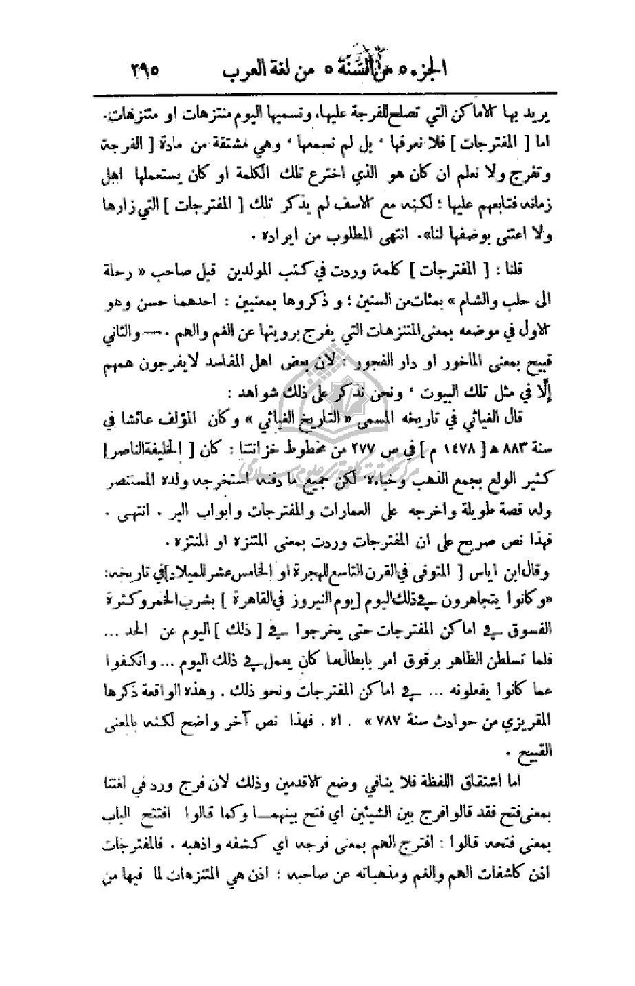 أما اشتقاق اللفظة فلا ينافي وضع الأقدمين وذلك لأن فرج ورد في لغتنا بمعنى فتح فقد قالوا فرج بين الشيئين أي فتح بينهما وكما قالوا افتتح الباب بمعنى فتحة قالوا: افترج الهم بمعنى فرجه أي كشفه وأذهبه. فالمفترجات إذن كاشفات الهم والغم ومذهباته عن صاحبه؛ إذن هي المتنزهات لما فيها من