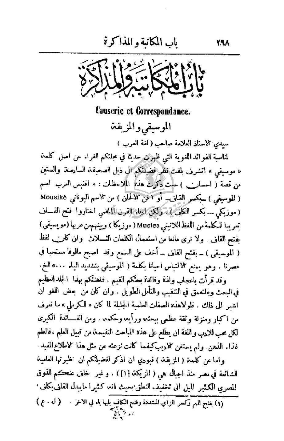 لمناسبة الفوائد اللغوية التي ظهرت حديثا في مجلتكم الغراء عن أصل كلمة (موسيقي) أتشرف بلفت نظر فضيلتكم إلى ذيل الصحيفة السادسة والستين من قصة (إحسان) حيث ذكرت هذه الملاحظات: (اقتبس العرب اسم (الموسيقي) - بكسر القاف - أو (فن الألحان) من الاسم اليوناني (موزيكي - بكسر الكاف). ولكن أدباء القرن الماضي اختاروا فتح القاف تعريبا للكلمة من اللفظ اللاتيني (موزيكا) وبينهم من عربها (موسيقى) بفتح القاف. ولا نرى مانعا من استعمال الكلمات الثلاث وإن كان لفظ (الموسيقى) - بفتح القاف - أخف على السمع وقد اصبح مألوفا مستحبا في عصرنا، وهو يمنع الالتباس أحيانا بكلمة (الموسيقي بتشديد الياء. . .) الخ.
