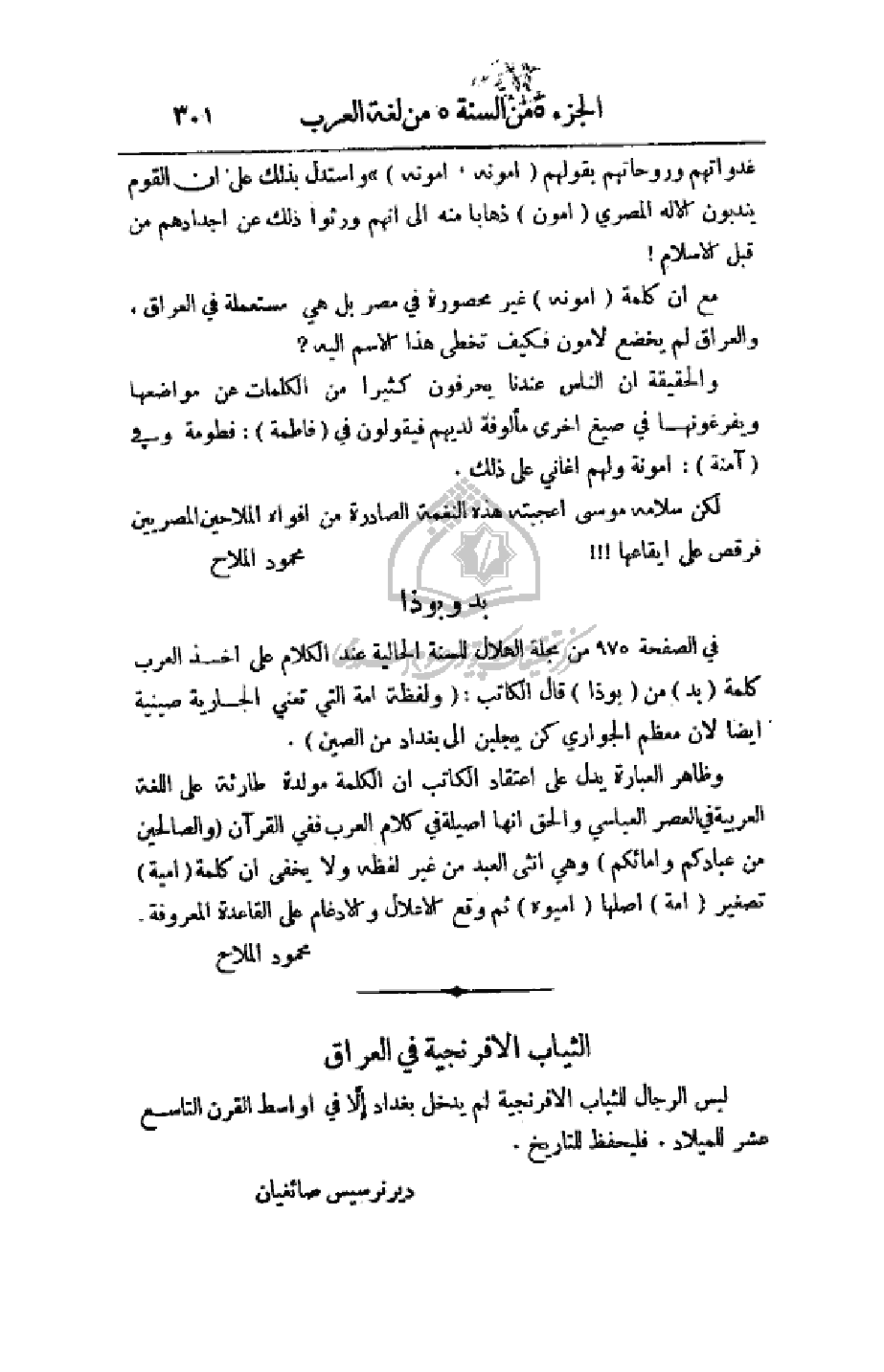 في الصفحة 975 من مجلة الهلال للسنة الحالية عند الكلام على أخذ العرب كلمة (بد) من (بوذا) قال الكاتب: (ولفظة أمة التي تعني الجارية صينية أيضاً لأن معظم الجواري كن يجلبن إلى بغداد من الصين).