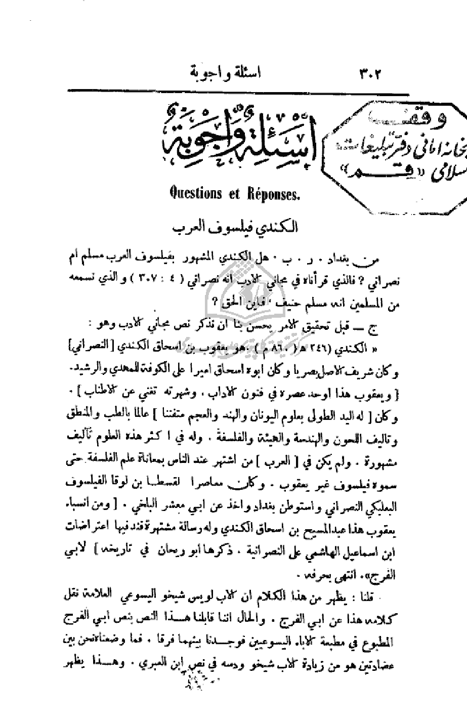 من بغداد. ر. ب. هل الكندي المشهور بفيلسوف العرب مسلم أم نصراني؟ فالذي قرأناه في مجاني الأدب أنه نصراني (307: 4) والذي نسمعه من المسلمين أنه مسلم حنيف، فأين الحق؟