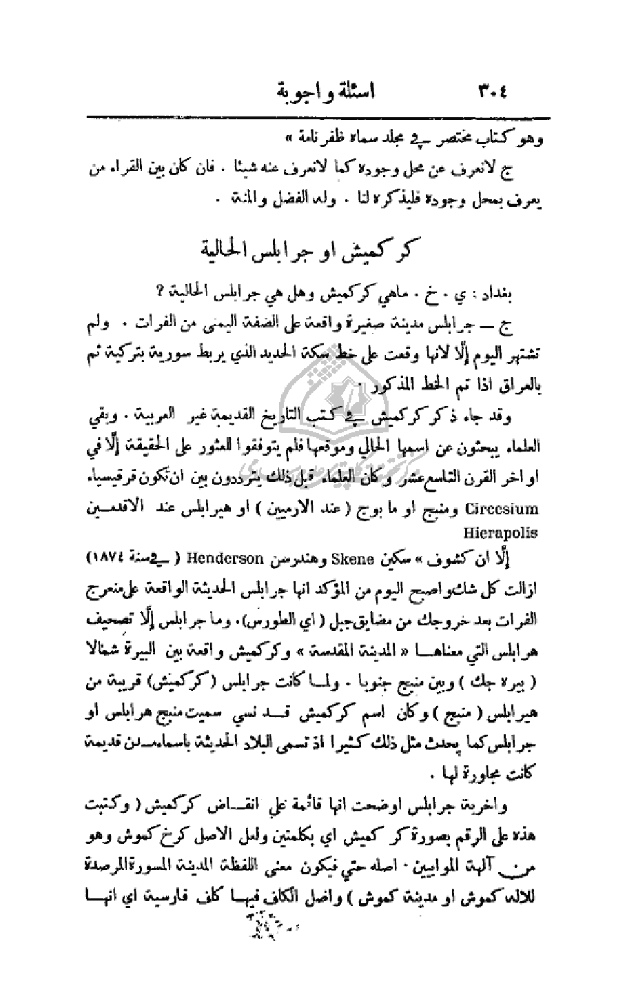 إلا أن كشوف) سكين وهندرسن (في سنة 1874) أزالت كل شك وأصبح اليوم من المؤكد أنها جرابلس الحديثة الواقعة على منعرج الفرات بعد خروجك من مضايق جبل (أي الطورس). وما جرابلس إلا تصحيف هرابلس التي معناها (المدينة المقدسة) وكركميش واقعة بين البيرة شمالا (بيرة جك) وبين منبج جنوبا. ولما كانت جرابلس (كركميش) قريبة من هيرابلس (منبج) وكان اسم كركميش قد نسي سميت منبج هرابلس أو جرابلس كما يحدث ذلك كثيرا إذ تسمى البلاد الحديثة بأسماء قديمة كانت مجاورة لها.