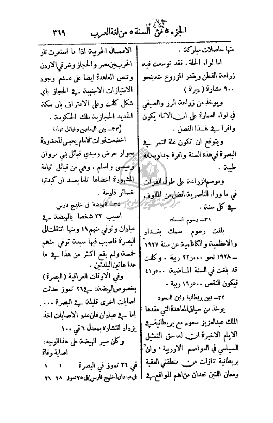بلغت رسوم السمك في بغداد والأعظمية والكاظمية عن سنة 1927 - 1928 نحو 22000 ربية. وكانت قد بلغت في السنة الماضية 41500 فيكون النقص 19500 ربية.