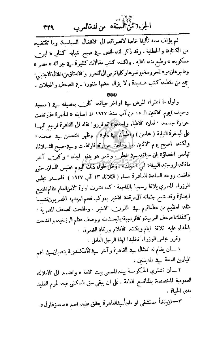 2 - أن تشتري الحكومة بيته المسمى بيت الأمة وتضمه إلى الأملاك العمومية المخصصة بالمنافع العامة، على أن يبقى حق السكنى فيه لحرم الفقيد مدى الحياة.