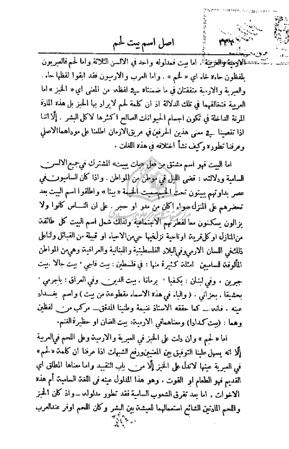 الارمية والعربية. أما بيت فمدلوله واحد في الألسن الثلاثة. وأما لحم فالعبريون يلفظون حاءه خاء أي (لخم). وأما العرب والارميون فقد أبقوا لفظها حاء. والعبرية والارمية متفقتان في ما ضمنتاه في لفظه من المعنى أي (الخبز) أما العربية فتخالفهما في تلك الدلالة ذا أن كلمة لحم لا يراد بها الخبز بل هذه المادة المرنة الداخلة في تكوين أجسام الحيوانات الصالح أكثرها لأكل