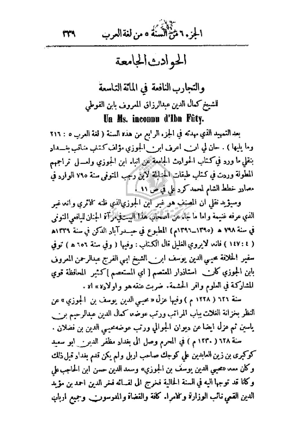 يعد التمهيد الذي مهدته في الجزء الرابع من هذه السنة (لغة العرب 5: 216 وما يليها). حان لي أن أعرف ابن الجوزي مؤلف كتاب مناقب بغداد بنقلي ما ورد في كتاب الحوادث الجامعة على أنباء ابن الجوزي ولعل تراجمهم المطولة وردت في كتاب بقات الحنابلة لأبن رجب المتوفى سنة 795 الوارد في مصادر خطط الشام لمحمد كرد علي في ص11.