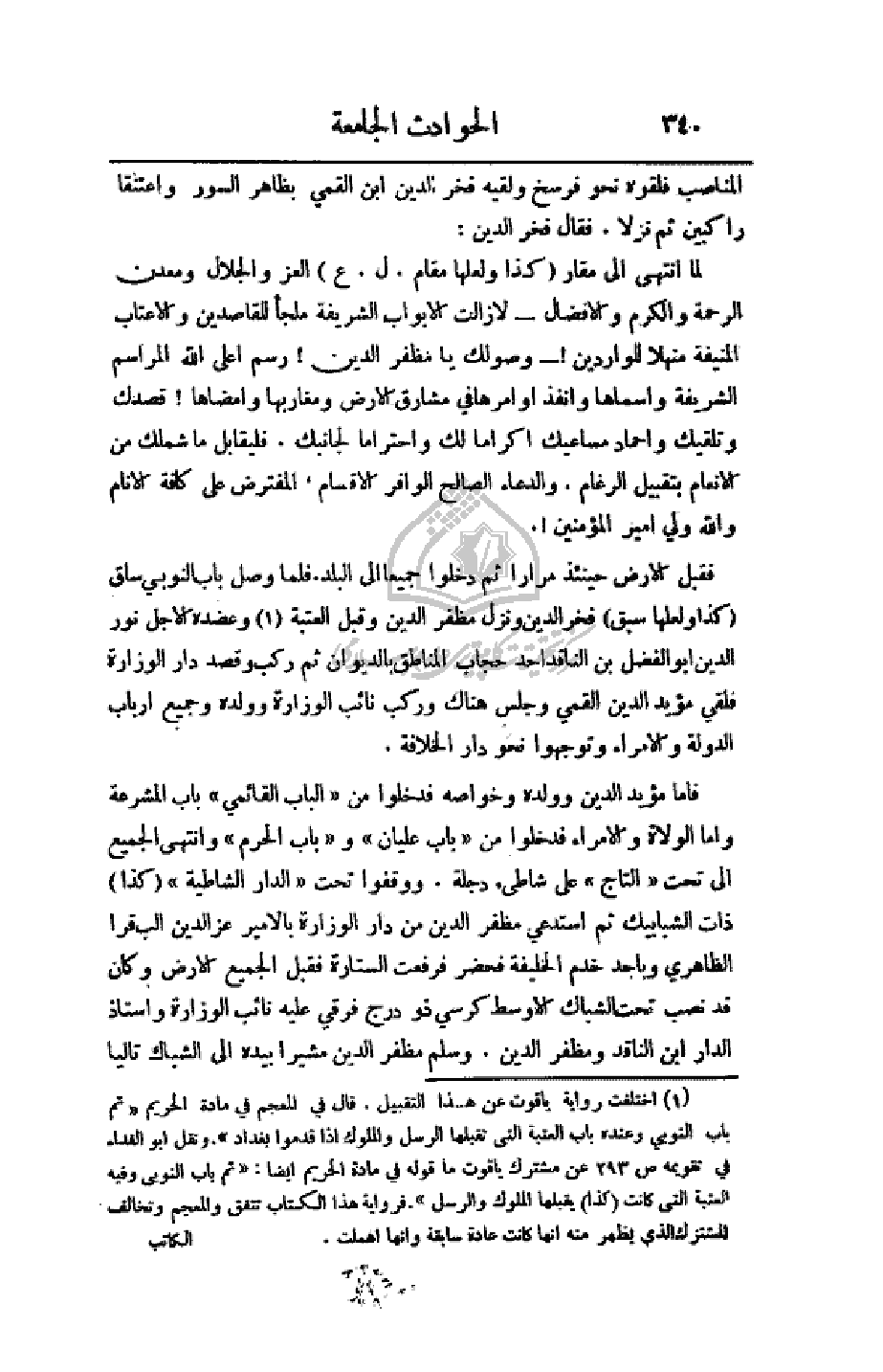 فقبل الأرض حينئذ مراراً ثم دخلوا جميعاً إلى البلد، فلما وصل إلى باب النوبي ساق (كذا ولعلها سبق) فخر الدين وسبقها مظفر الدين وقبل العتبة وعضده الأجل نور الدين أبو الفضل بن الناقد أحد حجاب المناطق بالديوان ثم ركب وقصد دار الوزارة فلقي مؤيد الدين القمي وجلس هناك وركب نائب الوزارة وولده وجميع أرباب الدولة والأمراء وتوجهوا نحو دار الخلافة.