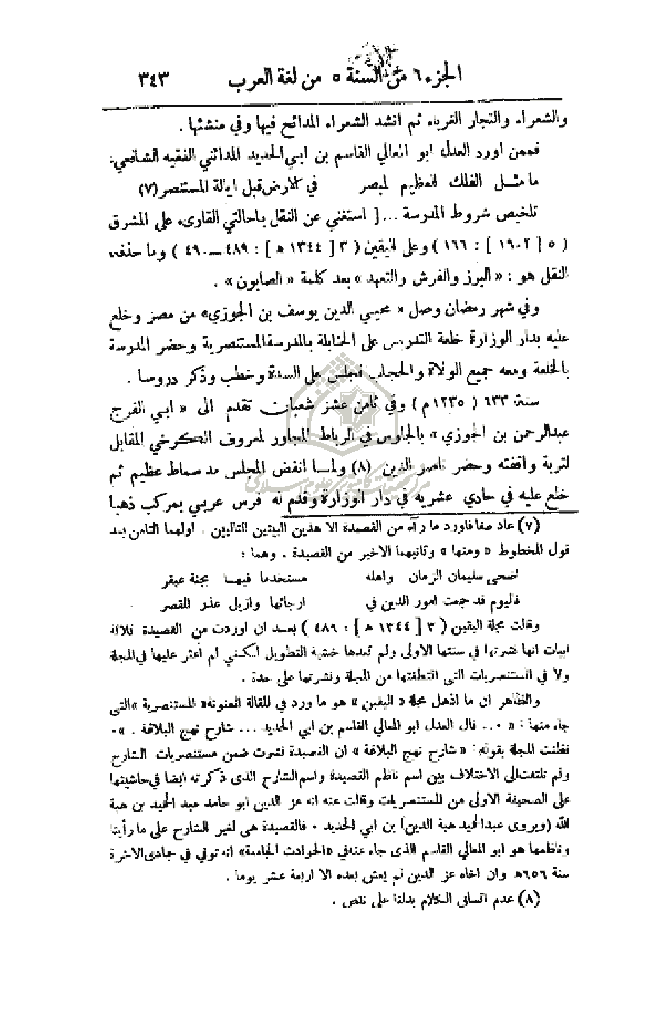 وفي شهر رمضان وصل (محي الدين يوسف بن الجوزي) من مصر وخلع عليه بدار الوزارة خلعة التدريس على الحنابلة بالمدرسة المستنصرية وحضر المدرسة بالخلعة ومعه جميع الولاة والحجاب فجلس على السدة وخطب وذكر دروساً. . .