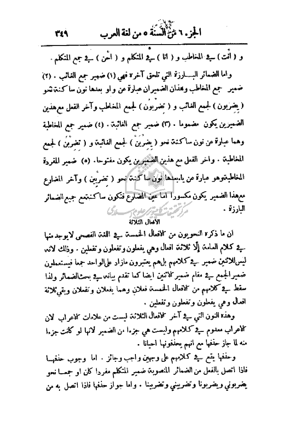 إن ما ذكره النحويون من الأفعال الخمسة في اللغة الفصحى لا يوجد منها في كلام العامة إلا ثلاثة أفعال وهي يفعلون وتفعلون وتفعلين. وذلك لأنه ليس للاثنين ضمير في كلامهم بل هم يعتبرون ما زاد على الواحد جمعاً فيستعملون ضمير الجمع في مقام ضمير الاثنين أيضاً كما تقدم بيانه في بحث الضمائر ولذا سقط في كلامهم من الأفعال الخمسة فعلان وهما يفعلان وتفعلان وبقي ثلاثة أفعال وهي يفعلون وتفعلون وتفعلين.