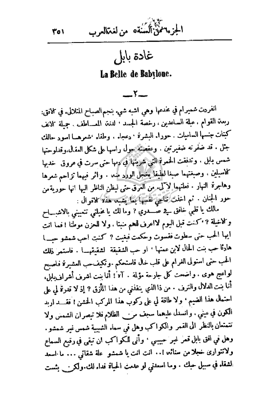 مالك يا قلبي خافق في صدري؟ ومالك يا مخيلتي تتعبيني بالأشباح والأخيلة؟، كنت قبل اليوم لا أعرف للهم منبتاً، ولا للحزن موطناً! فما أنت أيها الحب حتى سطوت فقسوت وحكمت فبغيت؟ كنت أحب شمشو حباً هادئاً حب بنت الخال لأبن عمتها، أو حب الشقيقة لشقيقها. فأستمر ذلك الحب حتى استولى الغرام على قلب خال فاستحكم. وتكيف حب العشيرة فأصبح لواعج هوى، وأضحت كل جارحة مؤلمة، آه! أنا بنت أشرف أشراف بابل، أنا بنت الدلال والترف، من ذا الذي ينقذني من هذا المأزق؟ إذ لا قدرة لي على احتمال ذا الضيم، ولا طاقة لي على ركوب هذا المركب الخشن! فقد أربد الكون في عيني، وانسدل عليهما سجف من الظلام فلا تبصران الشمس ولا تتمتعان بالنظر إلى القمر والكواكب وهل في سماء الشبيبة شمس غير شمس شمشو. وهل في أفق بابل قمر غير حبيبي، وأنا للكواكب أن تبقى في ريع السماع ولا تتواري خجلاً من سنائه!. . أنت أنت يا شمشو علة شقائي. . . ما أسعد الشقاء في سبيل حبك. وما أسعدني لو عدمت الحياة فداء لك. ولكن بئست