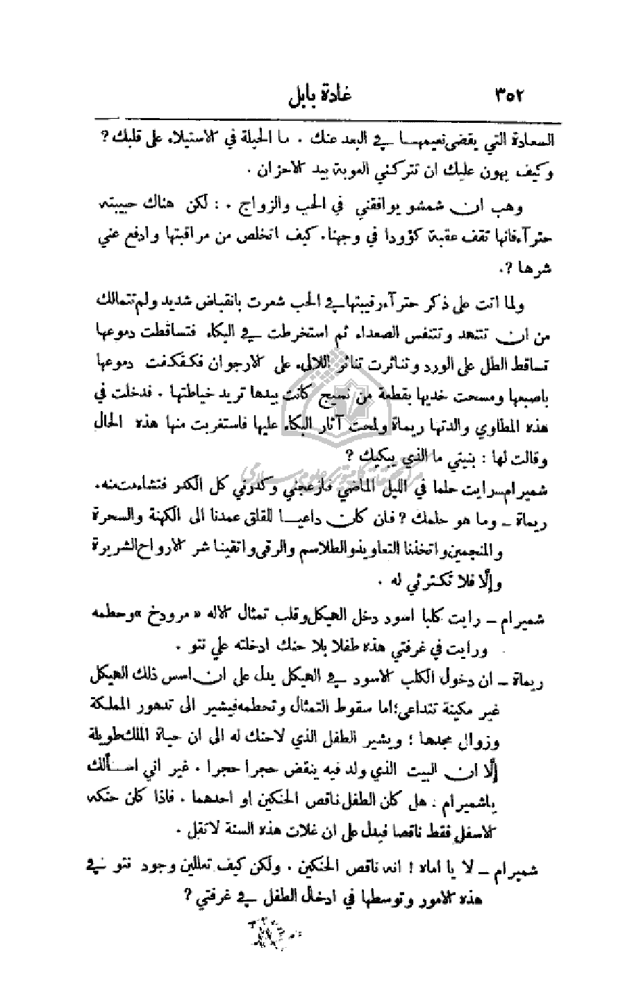 ولما أتت على ذكر حتراء رقيبتها في الحب شعرت بانقباض شديد لم تتمالك من أن تتنهد وتنفس الصعداء ثم استخرطت في البكاء فتساقطت دموعها تساقط الطل على الورد وتناثرت تناثر اللآلئ على الأرجوان فكفكفت دموعها بإصبعها وسمحت خديها بقطعة من نسيج كانت بيدها تريد خياطتها. فدخلت في هذه المطاوي والدتها ريماة ولمحت آثار البكاء عليها فاستغربت منها هذه الحال وقالت لها: بنيتي ما الذي يبكيك؟