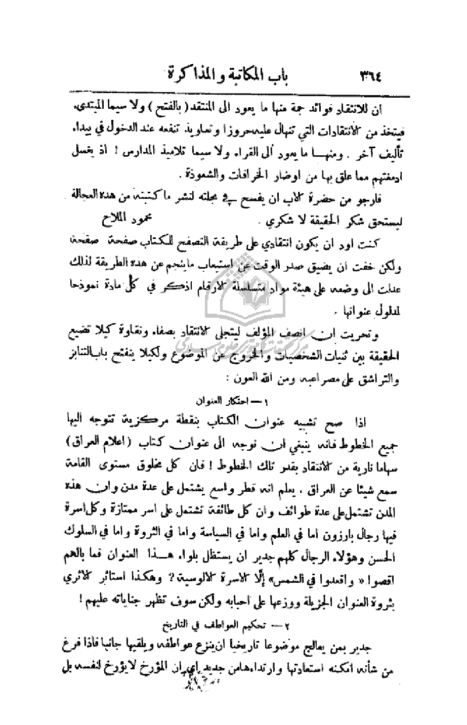 إن للانتقاد فوائد جمة منها ما يعود إلى المنتقد (بالفتح) ولا سيما المبتدئ فيتخذ من الانتقادات التي تنهال عليه حروزاً وتعاويذ تنفعه عند الدخول في بيداء تأليف آخر، ومنها ما يعود إلى القراء ولا سيما تلاميذ المدارس! إذ يغسل أدمغتهم مما علق بها من أوضار الخرافات والشعوذة.
