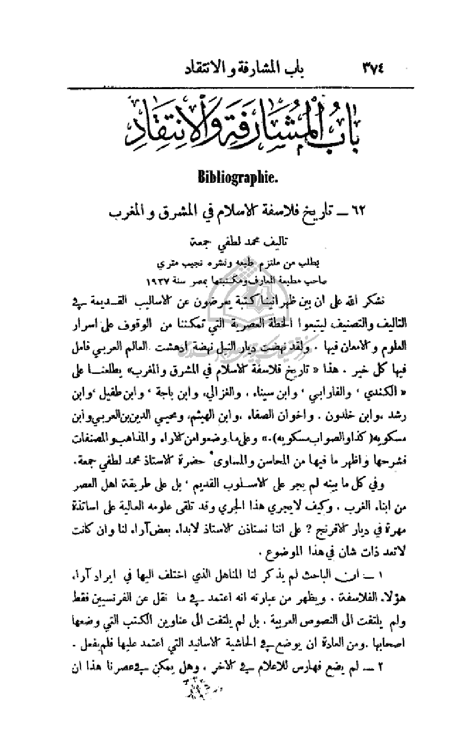 نشكر الله على أن بين ظهرانينا كتبة يعرضون عن الأساليب القديمة في التأليف والتصنيف ليتبعوا الخطة العصرية التي تمكننا من الوقوف على أسرار العلوم والإمعان فيها. ولقد نهضت ديار النيل نهضة أدهشت العالم العربي فأمل فيها كل خير، هذا (تأريخ فلاسفة الإسلام في المشرق والمغرب) يطلعنا على (الكندي، والفارابي، وابن سيناء، والغزالي، وابن باجة، وابن طفيل، وابن رشد، وابن خلدون، وأخوان الصفاء، وابن الهيثم، ومحي الدين بن العربي وابن مسكويه (كذا والصواب مسكويه).) وعلى ما وضعوا من الآراء والمذاهب والمصنفات فشرحها وأظهر ما فيها من المحاسن والمساوئ حضرة الأستاذ محمد لطفي جمعة.