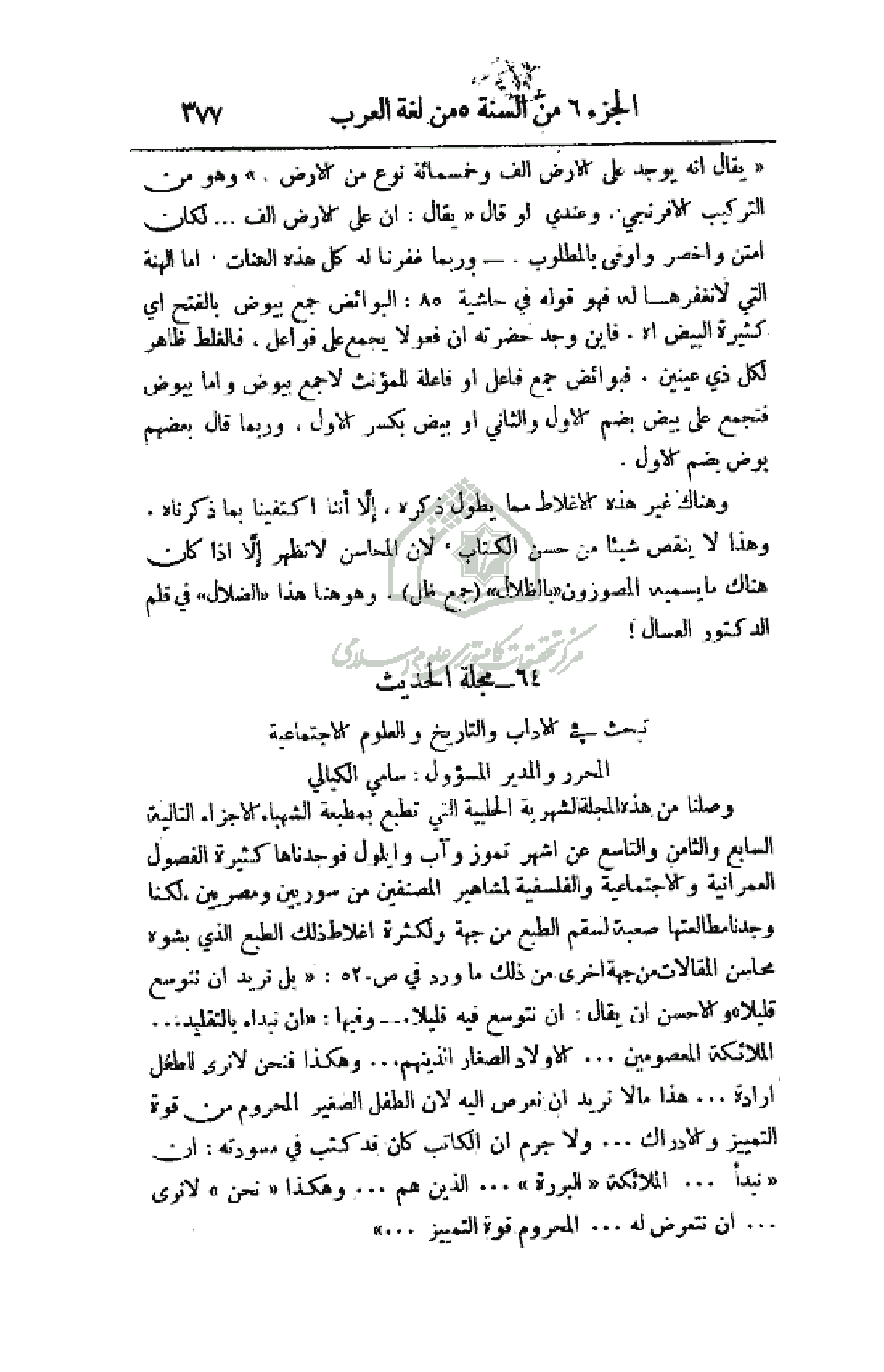 (ويقال أنه يوجد على الأرض ألف وخمسمائة نوع من الأرض.) وهو من التركيب الإفرنجي. وعندي لو قال (يقال: أن على الأرض ألف. . . لكان أمتن وأخصر وأوفى بالمطلوب. - وربما غفرنا له كل هذه الهنات، أما الهنة التي لا نغفرها له فهو قوله في حاشية 85: البوائض جمع بيوض بالفتح أي كثيرة البيض اهـ. فأين وجد حضرته أن فعولا يجمع على فواعل، فالغلط ظاهر لكل ذي عينين، فبوائض جمع فاعل أو فاعلة للمؤنث لا جمع بيوض وأما بيوض فتجمع على بيض بضم الأول والثاني أو بيض بكسر الأول، وربما قال بعضهم بوض بضم الأول.