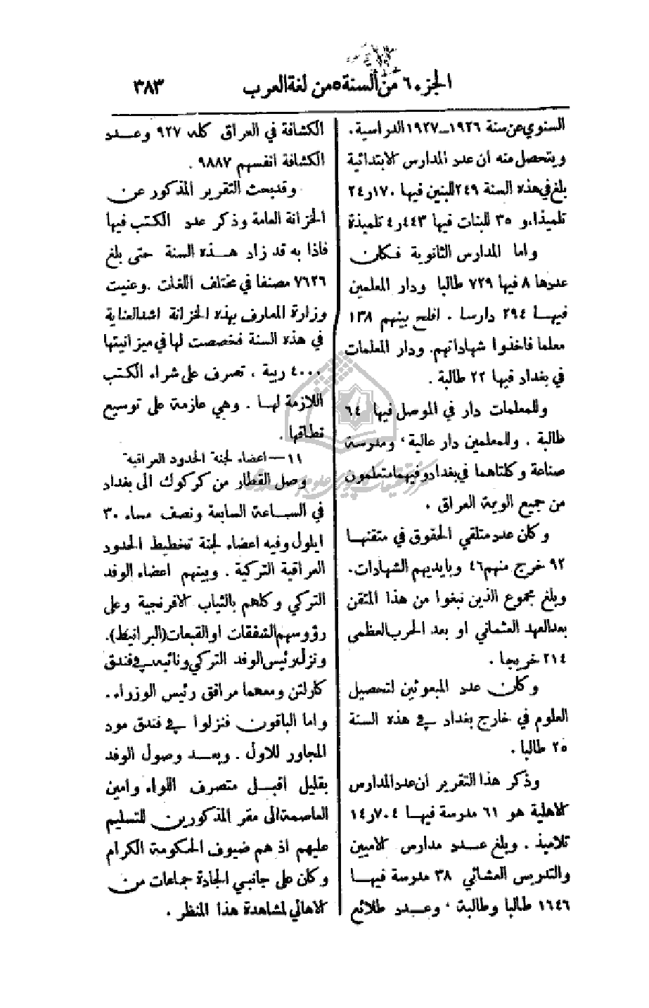 السنوي عن سنة 1926 - 1927 الدراسية. ويتحصل منه أن عدد المدارس الابتدائية بلغ هذه السنة 249 للبنين فيها 24. 170 تلميذاً و 35 للبنات فيها 4. 443 تلميذة.