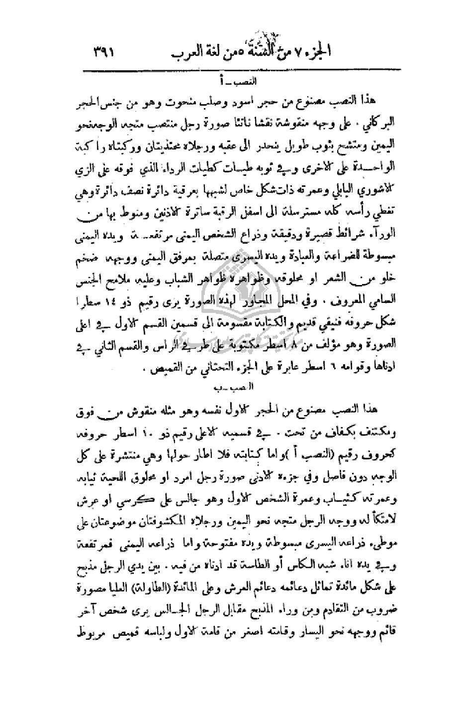 هذا النصب مصنوع من حجر اسود وصلب منحوت وهو من جنس الحجر البركاني. على وجهه منقوشة نقشا ناتئا صورة رجل منتصب متجه الوجه نحو اليمين ومتشح بثوب طويل ينحدر إلى عقبه ورجلاه محتذيتان وركبتاه راكبة الواحدة على الأخرى وفي ثوبه طيات كطيات الرداء الذي فوقه على الزي الآشوري البابلي وعمرته ذات شكل خاص لشبهها بعرقية دائرة نصف دائرة وهي تغطي رأسه كله مسترسلة إلى اسفل الرقبة ساترة الأذنين ومنوط بها من الوراء شرائط قصيرة ودقيقة وذراع الشخص اليمنى مرتفعة ويده اليمنى مبسوطة للضراعة والعبادة ويده اليسرى متصلة بمرفق اليمنى ووجهه ضخم خلو من الشعر أو محلوقه وظواهره ظواهر الشباب وعليه ملامح الجنس السامي المعروف. وفي المحل المجاور لهذه الصورة يرى رقيم ذو 14 سطرا شكل حروفه فنيقي قديم والكتابة مقسومة إلى قسمين القسم الأول في أعلى الصورة وهو مؤلف من 8 اسطر مكتوبة على طرفي الرأس والقسم الثاني في أدناه وقوامه 6 اسطر عابرة على الجزء التحتاني من القميص.