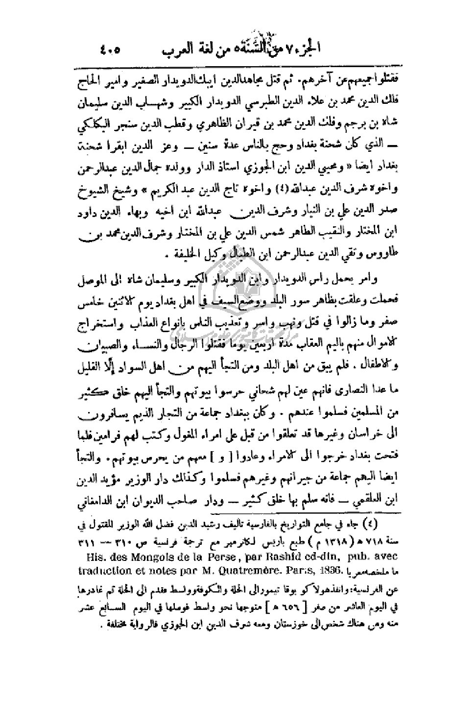 بظاهر سور البلد ووضع السيف في أهل بغداد يوم الاثنين خامس صفر وما زالوا في قتل ونهب واسر وتعذيب الناس بأنواع العذاب واستخراج الأموال منهم باليم العقاب مدة أربعين يوما فقتلوا الرجال والنساء والصبيان والأطفال. فلم يبق من أهل البلد ومن التجأ إليهم من أهل السواد إلا القليل ما عدا النصارى فانهم عين لهم شحاني حرسوا بيوتهم والتجأ إليهم خلق كثير من المسلمين فسلموا عندهم. وكان ببغداد جماعة من التجار الذين يسافرون إلى خراسان وغيرها قد تعلقوا من قبل على أمراء المغول وكتب لهم فرامين فلما فتحت بغداد خرجوا إلى الأمراء وعادوا (و) معهم من يحرس بيوتهم. والتجأ أيضاً إليهم جماعة من جيرانهم وغيرهم فسلموا وكذلك دار الوزير مؤيد الدين ابن العلقمي - فانه سلم بها خلق كثير - ودار صاحب الديوان ابن الدامغاني