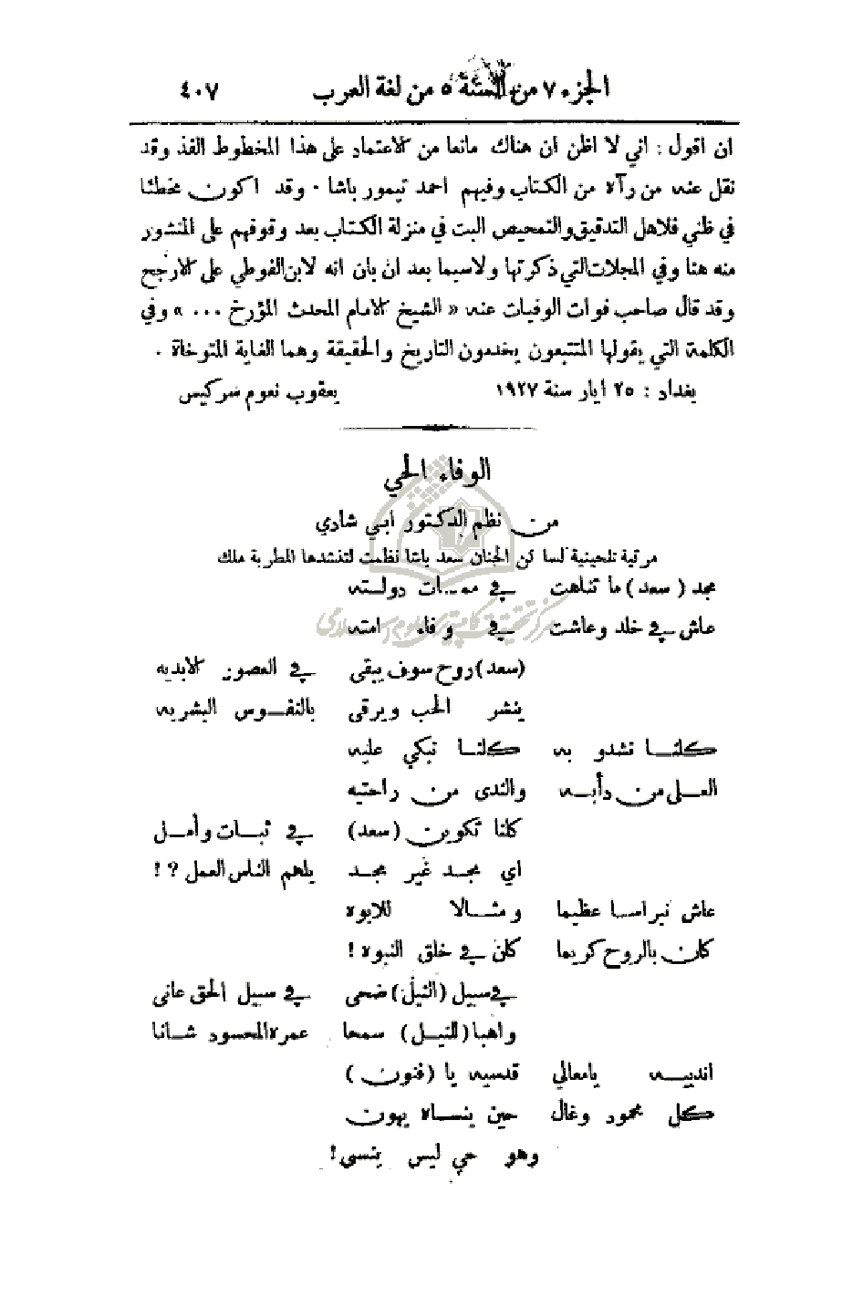 أن أقول: أني لا أظن أن هناك مانعا من الاعتماد على هذا المخطوط الفذ وقد نقل عنه من رآه من الكتاب وفيهم احمد تيمور باشا. وقد أكون مخطئا في ظني فلأهل التدقيق والتمحيص البت في منزلة الكتاب بعد وقوفهم على المنشور منه هنا وفي المجلات التي ذكرتها ولا سيما بعد أن بان انه لابن الفوطي على الأرجح وقد قال صاحب فوات الوفيات عنه (الشيخ الإمام المحث المؤرخ. . .) وفي الكلمة التي يقولها المتتبعون يخدمون التاريخ والحقيقة وهما الغاية المتوخاة.