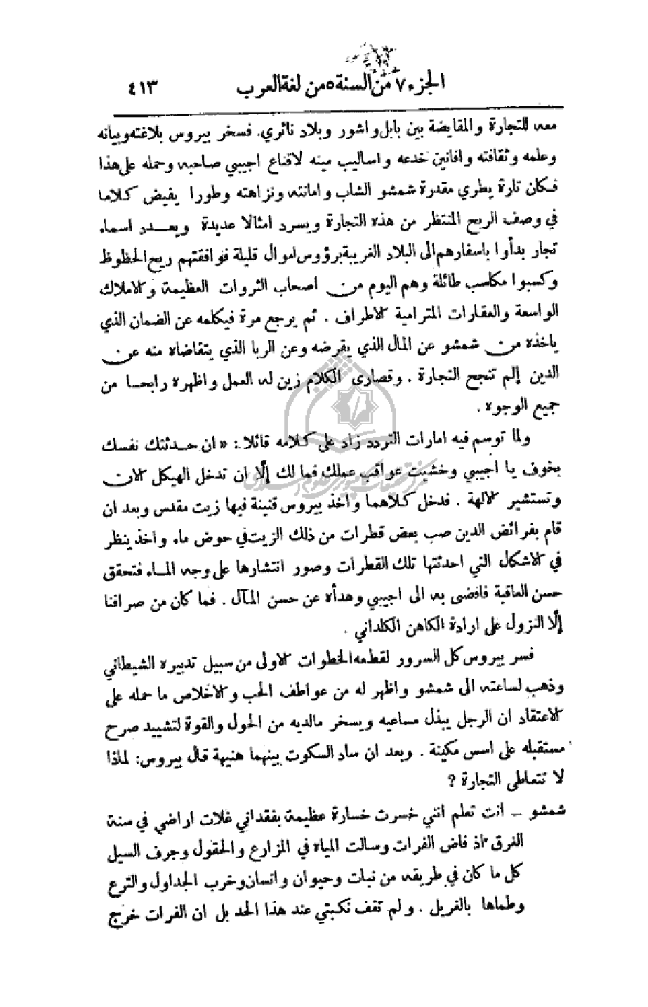 معه للتجارة والمقايضة بين بابل وأشور وبلاد نائري. فسخر بيروس بلاغته وبيانه وعلمه وثقافته وأفانين خدعه وأساليب مينه لإقناع أجيبي صاحبه وحمله على هذا فكان تارة يطري مقدرة شمشو الشاب وأمانته ونزاهته وطورا يفيض كلاما في وصف الربح المنتظر من هذه التجارة ويسرد أمثالا عديدة ويعدد أسماء تجار بدءوا بأسفارهم إلى البلاد الغريبة برؤوس أموال قليلة فوافقتهم ريح الحظوظ وكسبوا مكاسب طائلة وهم اليوم من أصحاب الثروات العظيمة والأملاك الواسعة والعقارات المترامية الأطراف. ثم يرجع مرة فيكلمه عن الضمان الذي يأخذه عن شمشو عن المال الذي يقرضه وعن الربا الذي يتقاضاه منه عن الدين ألم تنجح التجارة. وقصارى الكلام زين له العمل وأظهره رابحا من جميع الوجوه.
