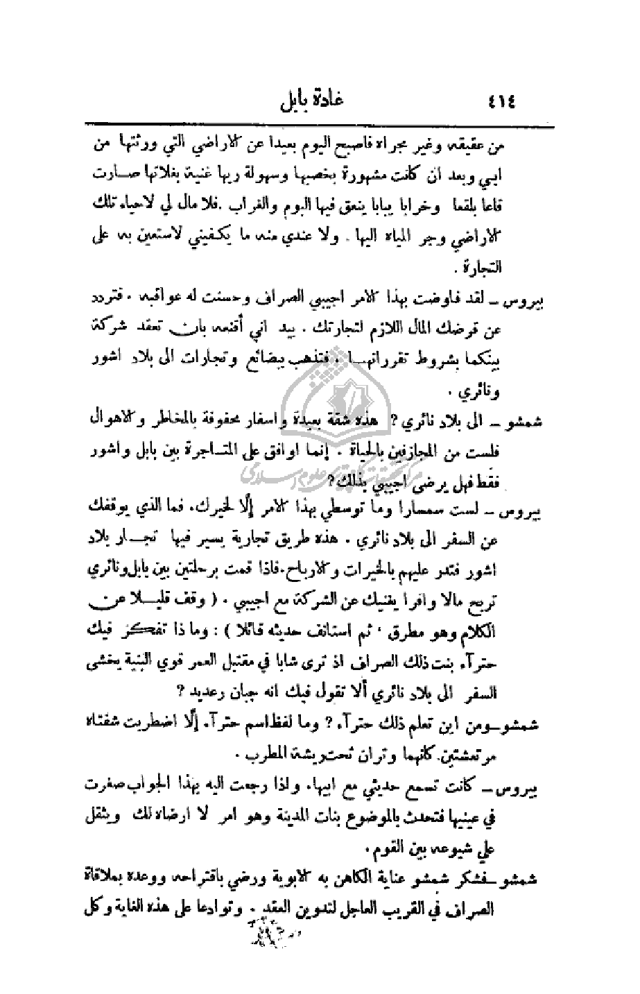 بيروس - لست سمسارا وما توسطي بهذا الأمر إلا لخيرك. فما الذي يوقفك عن السفر إلى بلاد نائري. هذه طريق تجارية يسير فيها تجار بلاد أشور فتدر عليهم بالخيرات والأرباح. فإذا قمت برحلتين بين بابل ونائري اربح مالا وافرا يغنيك عن الشركة مع أجيبي. (وقف قليلا عن الكلام وهو مطرق، ثم استأنف حديثه قائلا): وماذا تفكر فيك حتراء بنت ذلك الصراف إذ ترى شابا في مقتبل العمر قوي البنية يخشى السفر إلى بلاد نائري إلا تقول فيك انه جبان رعديد؟