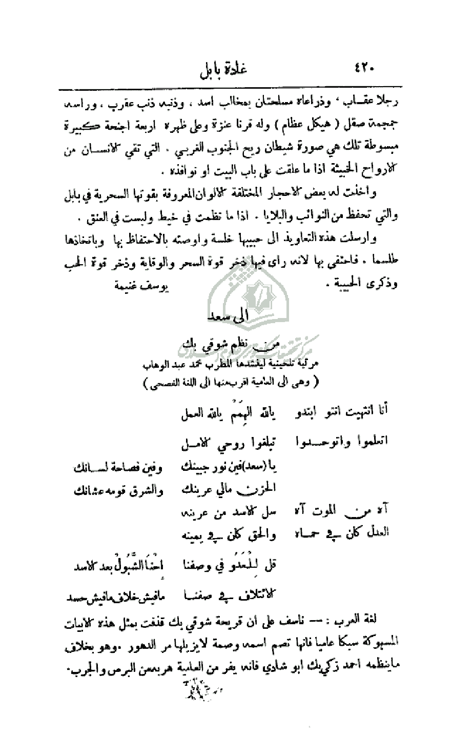 لغة العرب: - ناسف على أن قريحة شوقي بك قذفت بمثل هذه الأبيات المسبوكة سبكا عاميا فإنها تصم اسمه وصمة لا يزيلها مر الدهور. وهو بخلاف ما ينظمه احمد زكي بك أبو شادي فانه يفر من العامية هربه من البرص والجرب.