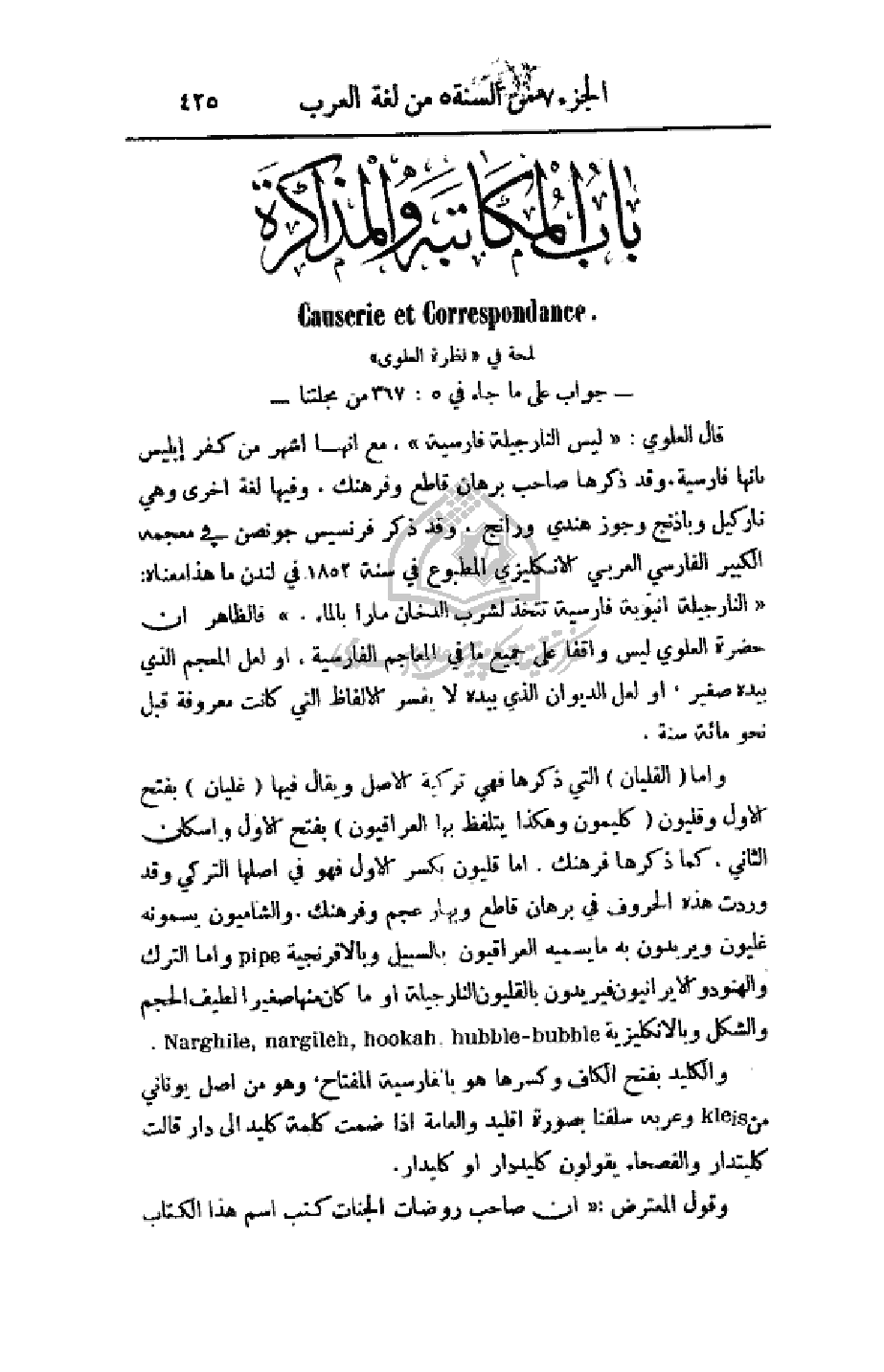 قال العلوي: (ليس النارجيلة فارسية). مع إنها أشهر من كفر إبليس بأنها فارسية. وقد ذكرها صاحب برهان قاطع وفرهنك. وفيها لغة أخرى وهي ناركيل وباذنج وجوز هندي ورانج. وقد ذكر فرنسيس جونصن في معجمه الكبير الفارسي العربي الإنكليزي المطبوع في سنة 1852 في لندن ما هذا معناه: (النارجيلة أنبوبة فارسية تتخذ لشرب الدخان مارا بالماء.) فالظاهر أن حضرة العلوي ليس واقفا على جميع ما في المعاجم الفارسية، أو لعل المعجم الذي بيده صغير، أو لعل الديوان الذي بيده لا يفسر الألفاظ التي كانت معروفة قبل نحو مائة سنة.