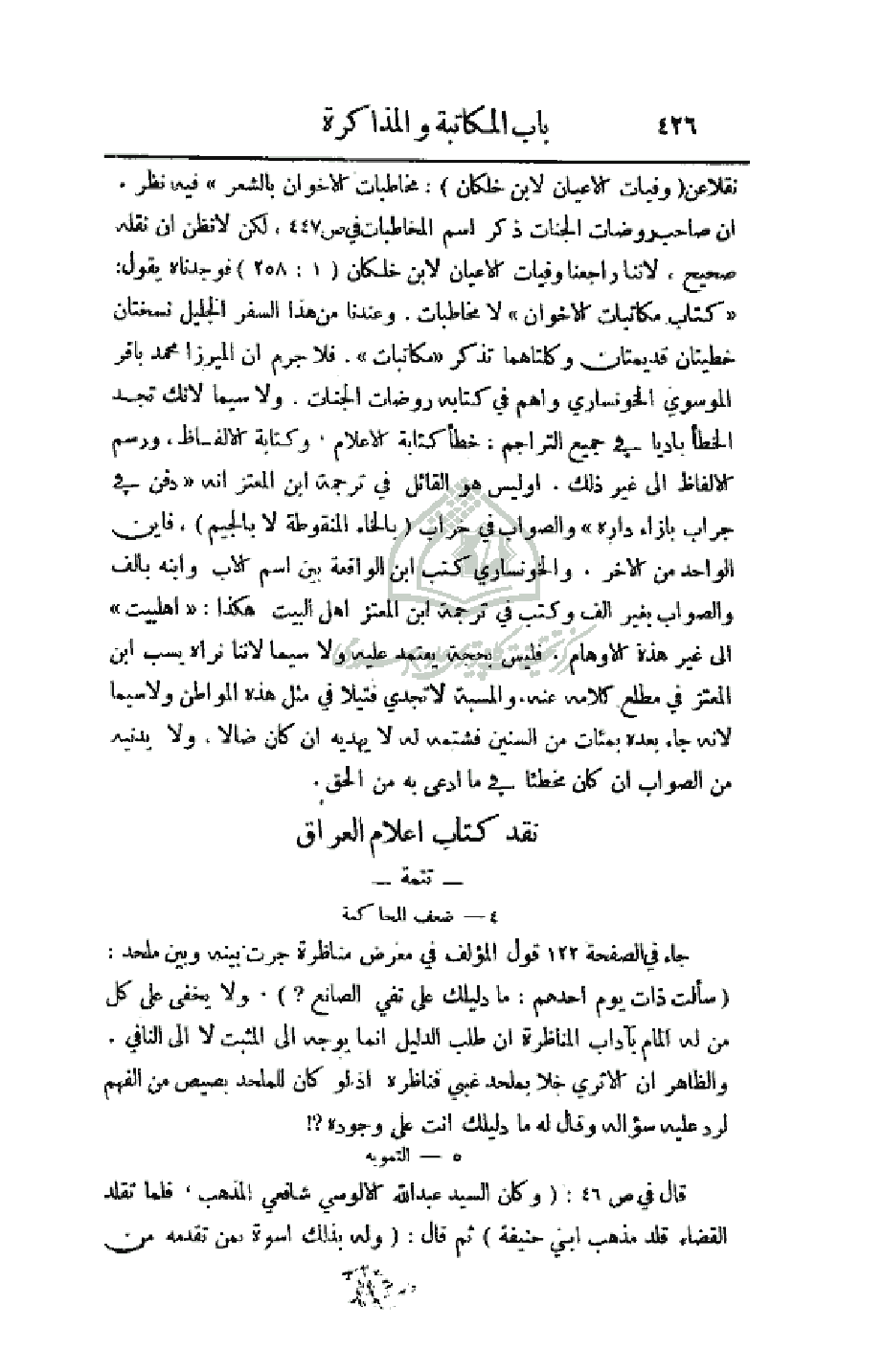 نقلا عن (وفيات الأعيان لابن خلكان): مخاطبات الإخوان بالشعر) فيه نظر. أن صاحب روضات الجنات ذكر اسم المخاطبات في ص 447، لكن لا نظن أن نقله صحيح، لأننا راجعنا وفيات الأعيان لابن خلكان (1: 258) فوجدناه يقول: (كتاب مكاتبات الإخوان) لا مخاطبات. وعندنا من هذا السفر الجليل نسختان خطيتان قديمتان وكلتاهما تذكر (مكاتبات). فلا جرم