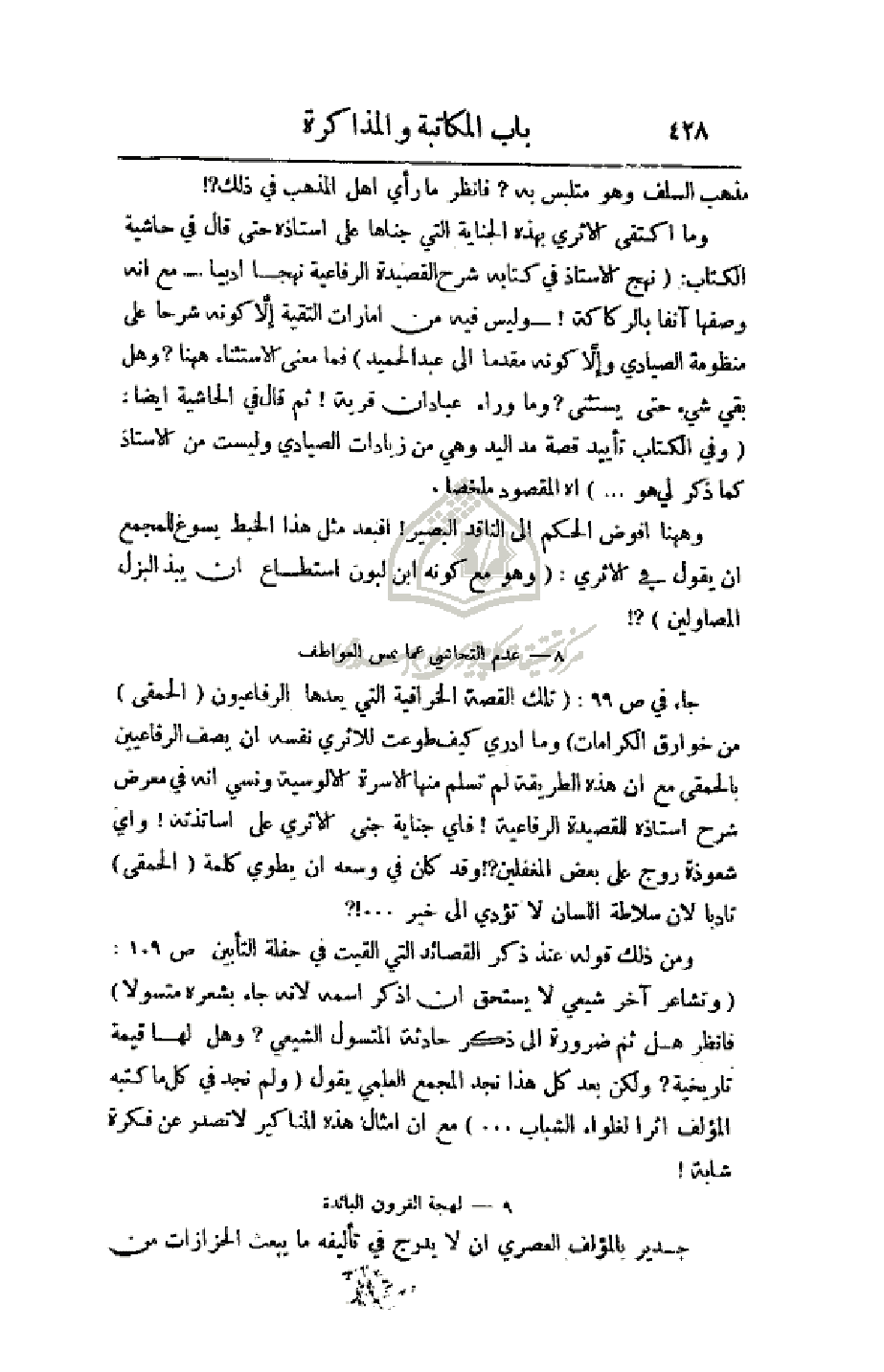 ومن ذلك قوله عند ذكر القصائد التي ألقيت في حفلة التأبين ص109: (وتشاعر آخر شيعي لا يستحق أن اذكر اسمه لأنه جاء بشعره متسولا) فانظر هل ثم ضرورة إلى ذكر حادثة المتسول الشيعي؟ وهل لها قيمة تاريخية؟ ولكن بعد كل هذا نجد المجمع العلمي يقول (ولم نجد في كل ما كتبه المؤلف أثرا لغلواء الشباب. . .) مع أن أمثال هذه المناكير لا تصدر عن فكرة شابة!