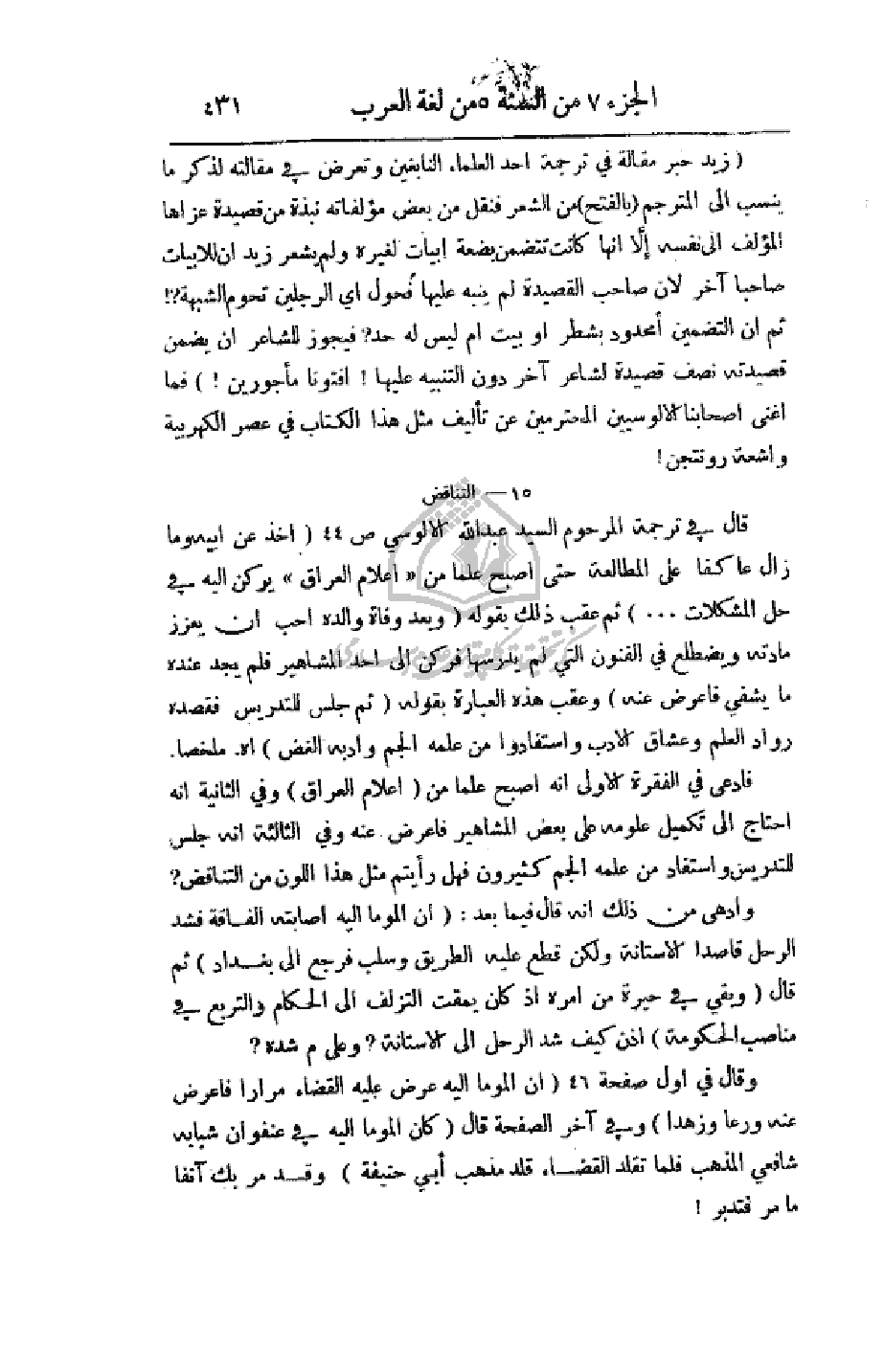قال في ترجمة المرحوم السيد عبد الله الالوسي ص44 (اخذ عن أبيه وما زال عاكفا على المطالعة حتى أصبح علما من (أعلام العراق) يركن إليه في حل المشكلات. . .) ثم عقب ذلك بقوله (وبعد وفاة والده احب أن يعزز مادته ويضطلع في الفنون التي لم يدرسها فركن إلى أحد المشاهير فلم يجد عنده ما يشفي فاعرض عنه) وعقب هذه العبارة بقوله (ثم جلس للتدريس فقصده رواد العلم وعشاق الأدب واستفادوا من علمه الجم وأدبه الغض) اهـ. ملخصا.