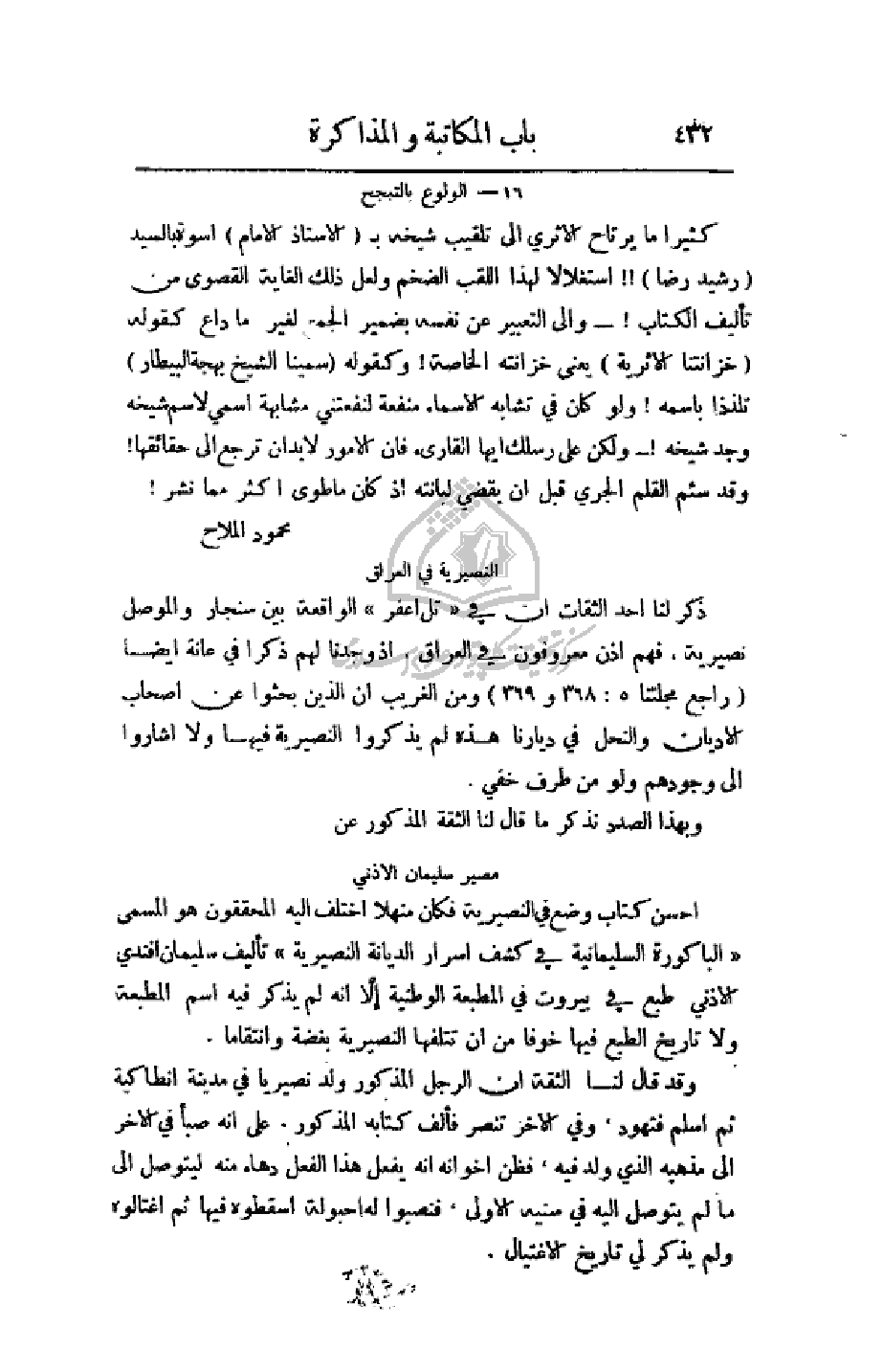 احسن كتاب وضع في النصيرية فكان منهلا اختلف إليه المحققون هو المسمى (الباكورة السليمانية في كشف أسرار الديانة النصيرية) تأليف سليمان أفندي الاذني طبع في بيروت في المطبعة الوطنية إلا انه لم يذكر فيه اسم المطبعة ولا تاريخ الطبع فيها خوفا من أن تتلفها النصيرية بغضة وانتقاما.