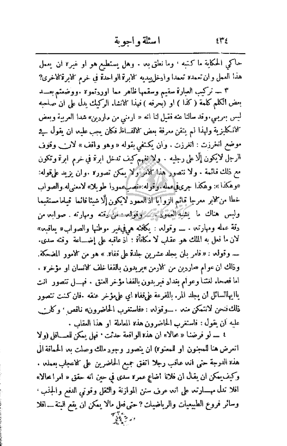 انه (ارمني من ماردين) شدا العربية وبعض الإنكليزية ولهذا لم يتقن معرفة بعض الألفاظ فكان يجب عليه أن يقول في موضع انخرزت: انغرزت، وأن يكتفي بقوله (وهو واقف) لان وقوف الرجل لا يكون إلا على رجليه. ولا نفهم كيف تدخل إبرة في خرم إبرة وتكون مع ذلك قائمة. ولا نتصور هذا الأمر ولا يمكن تصوره. وان يزيد على قوله: (وهكذا): وهكذا جرى في عمله. وقوله: (نصب عمودا طويلا) لا معنى له. والصواب خطا من الإبر معرجا قائم الوزايا إذ العمود لا يكون إلا شيئا قائما قياما مستقيما ولبس هناك ما يشبه العمود. - وقوله: من دقته ومهارته. صوابه من دقة عمله ومهارته. - وقوله: يكافئه هي في غير موطنها والصواب (يعاقبه) لان ما فعل به الملك هو عقاب لا مكافأة؛ إذ عاقبه على إضاعة وقته سدى. - وقوله: (فأمر بان يجلد عشرين جلدة على قفاه.) هو من الأمور المضحكة. وذلك أن عوام (ماردين من الأرمن) يريدون بالقفا خلف الإنسان أو مؤخره. أما فصحاء لغتنا وعوام بغداد فيريدون بالقفا مؤخر العنق. فهل تتصور أنت يا أيها السائل أن يجلد المرء بالمقرعة على قفاه أي على مؤخرة عنقه. فان كنت تتصور ذلك فنحن لا نتمكن منه. - وقوله: (فاستغرب الحاضرون) ناقص، وكان عليه أن يقول: فاستغرب الحاضرون هذه المعاملة أو هذا العقاب.