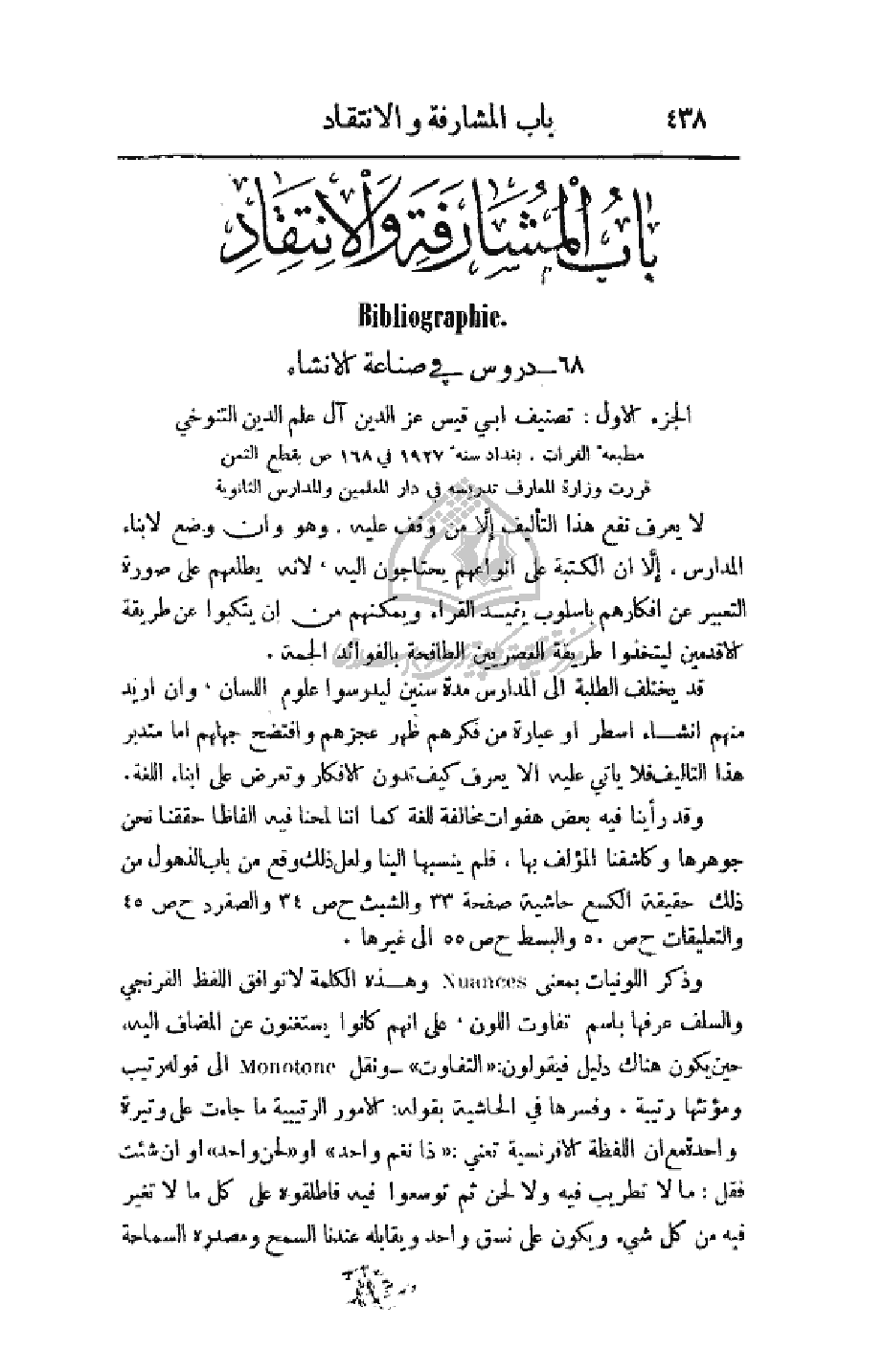 مطبعة الفرات. بغداد سنة 1927 في 168 ص بقطع الثمن