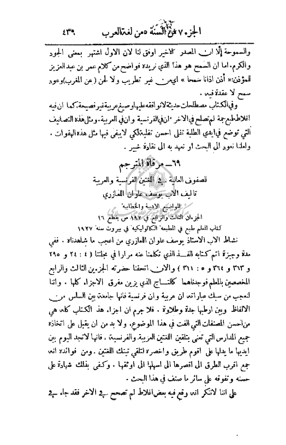 وفي الكتاب مصطلحات حديثة لا نوافقه عليها وصيغ عربية غير فصيحة، كما أن فيه أغلاط طبع جمة لم تصلح في الآخر، أن في الفرنسية وان في العربية. ومثل هذه التصانيف التي توضع في أيدي الطلبة تفلية احسن تفلية لكي لا يبقى فيها مثل هذه الهفوات. ولعلنا نعود إلى البحث أو نعهد به إلى نقادة خبير.