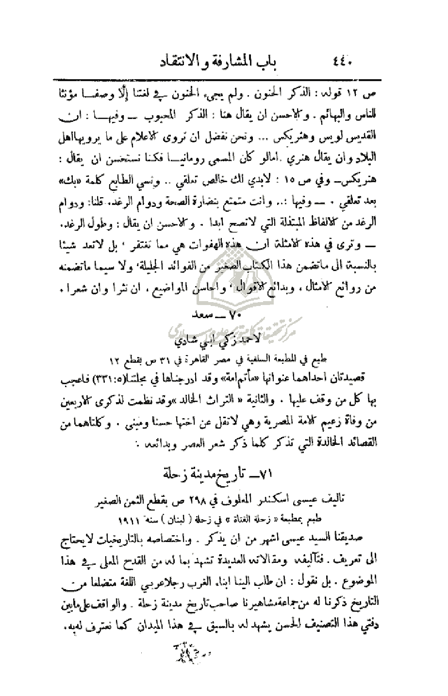 ص12 قوله: الذكر الحنون. ولم يجئ الحنون في لغتنا إلا وصفا مؤنثا للناس والبهائم. والأحسن أن يقال هنا: الذكر المحبوب - وفيها: أن القديس لويس وهنريكس. . . ونحن نفضل أن تروى الأعلام على ما يرويها أهل البلاد وان يقال هنري. أما لو كان المسمى رومانيا فكنا نستحسن أن يقال: هنريكس - وفي ص15: لأبدي لك خالص تعلقي. . ونسي الطابع كلمة (بك) بعد تعلقي. - وفيها:. . وأنت متمتع بنضارة الصحة ودوام الرغد. قلنا: ودوام الرغد