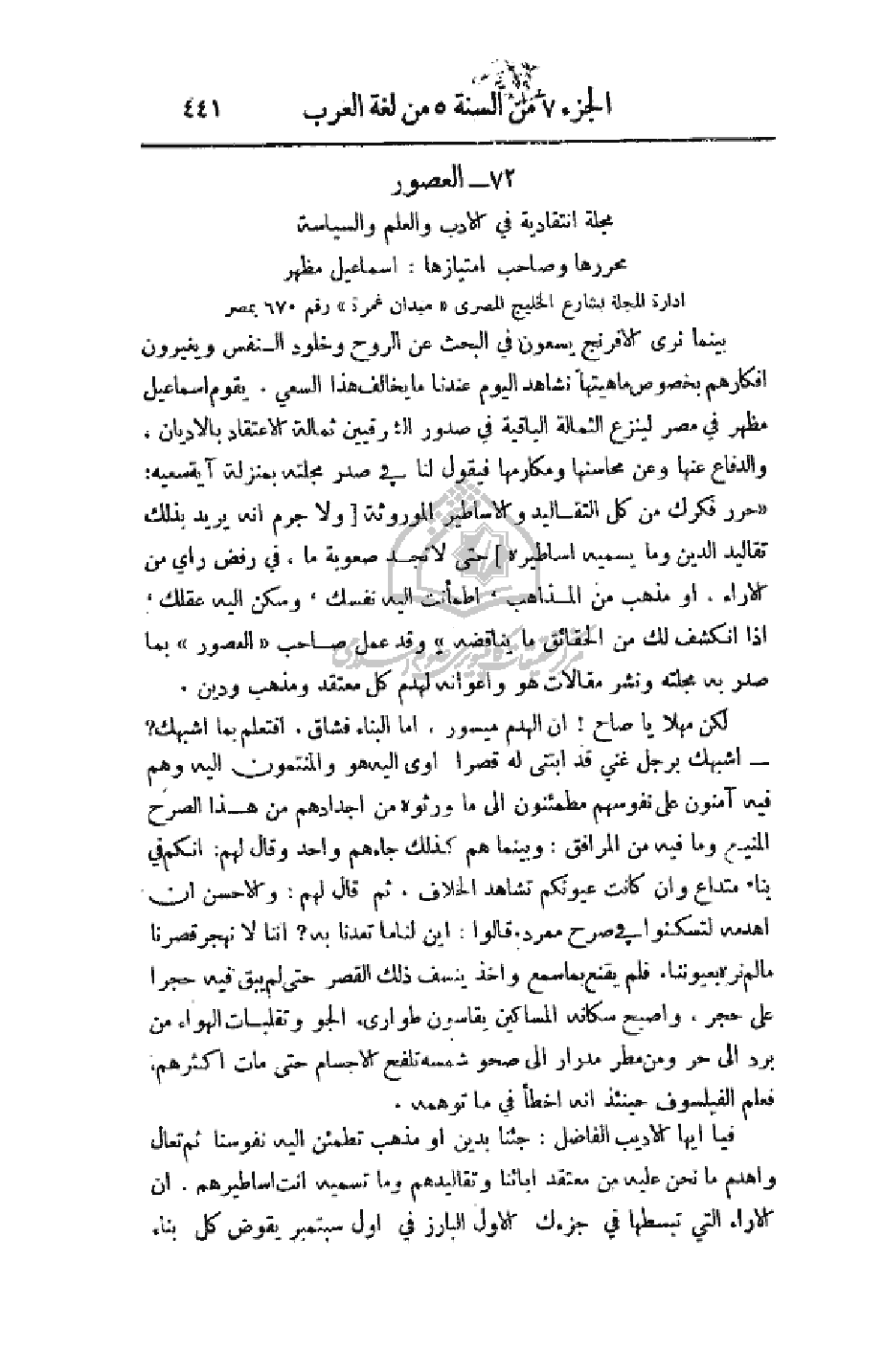 مجلة انتقادية في الأدب والعلم والسياسة، محررها وصاحب امتيازها: إسماعيل مظهر، إدارة المجلة بشارع الخليج المصري (ميدان غمرة) رقم 670 بمصر.