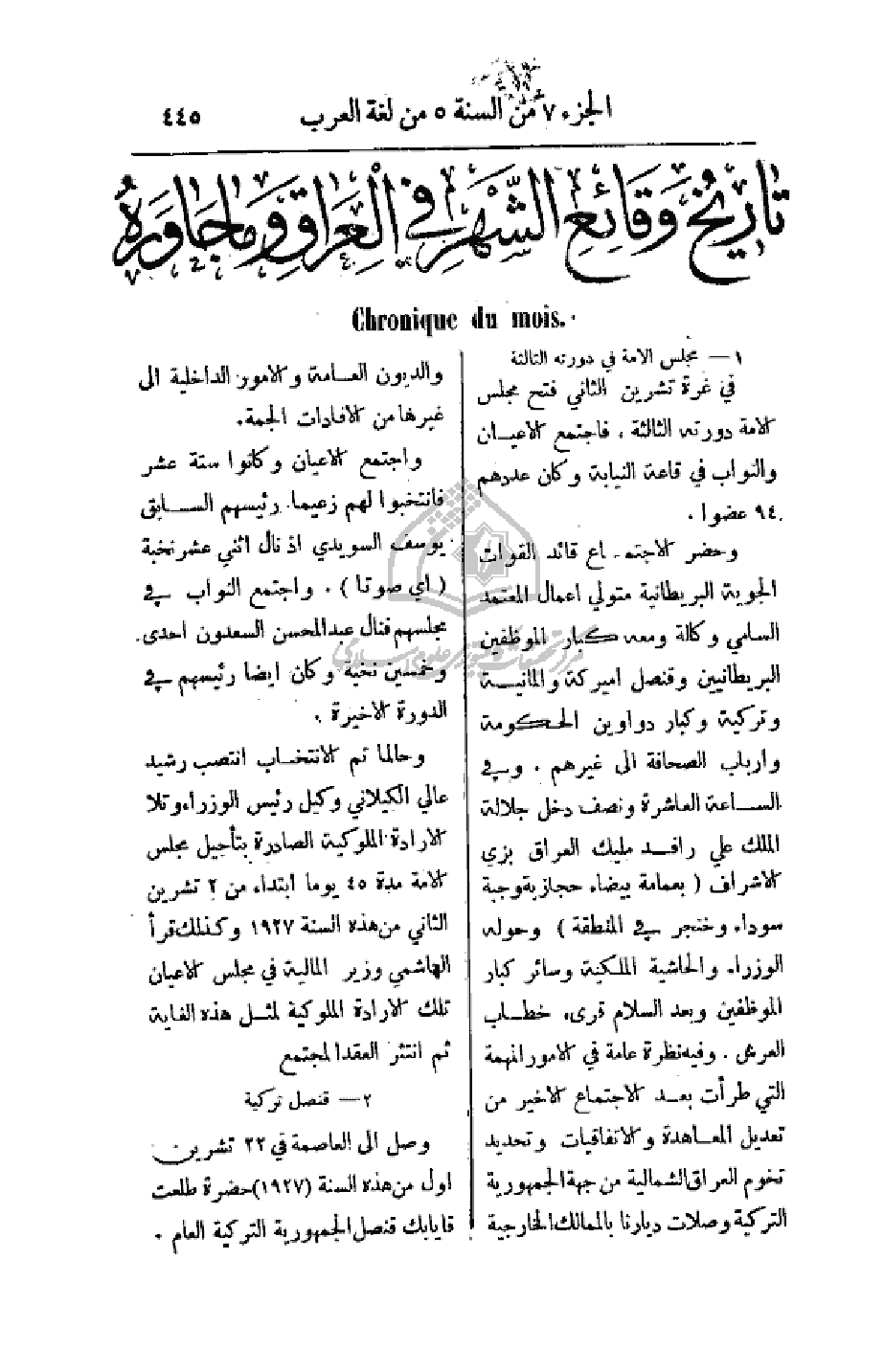 وحضر الاجتماع قائد القوات الجوية البريطانية متولي أعمال المعتمد السامي وكالة ومعه كبار الموظفين البريطانيين وقنصل أميركة وألمانية وتركية وكبار دواوين الحكومة وأرباب الصحافة إلى غيرهم. وفي الساعة العاشرة ونصف دخل جلالة الملك علي رافد مليك العراق بزي الأشراف (بعمامة بيضاء حجازية وجبة سوداء وخنجر في المنطقة) وحوله الوزراء والحاشية الملكية وسائر كبار الموظفين وبعد السلام قرء خطاب العرش. وفيه نظرة عامة في الأمور المهمة التي طرأت بعد الاجتماع الأخير من تعديل المعاهدة والاتفاقيات وتحديد تخوم العراق الشمالية من جهة الجمهورية التركية وصلات ديارنا بالممالك الخارجية والديون العامة والأمور الداخلية إلى غيرها من الإفادات الجمة.