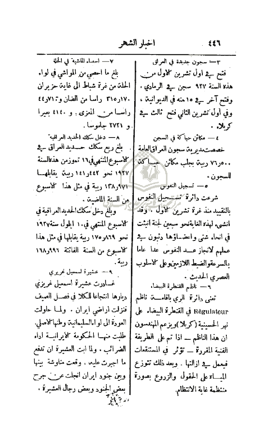 بلغ ريع سكك حديد العراق في الأسبوع المنتهي في 16 تموز من هذه السنة 1927 نحو 141. 442 ربية يقابلها 138. 971 ربية في مثل هذا الأسبوع من السنة الماضية.