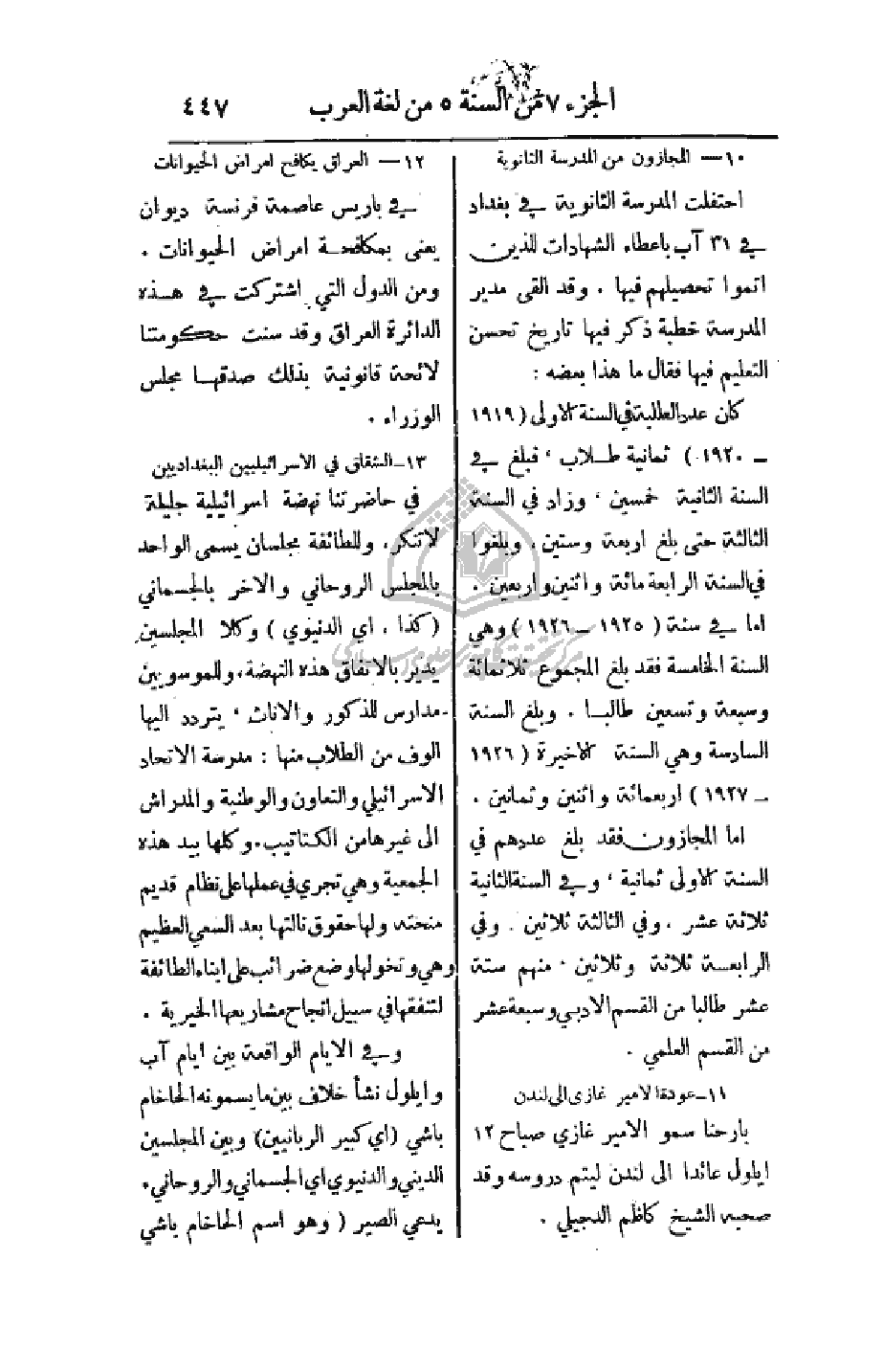 احتفلت المدرسة الثانوية في بغداد في 31 آب بإعطاء الشهادات للذين أتموا تحصيلهم فيها. وقد ألقى مدير المدرسة خطبة ذكر فيها تاريخ تحسن التعليم فيها فقال ما هذا بعضه: