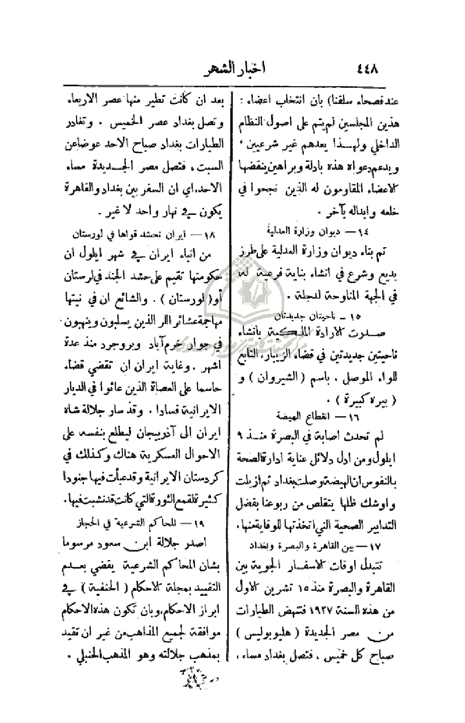 تتبدل أوقات الأسفار الجوية بين القاهرة والبصرة منذ 15 تشرين الأول من هذه السنة 1927 فتنهض الطيارات من مصر الجديدة (هليوبوليس) صباح كل خميس، فتصل بغداد مساء، بعد أن كانت تطير منها عصر الأربعاء وتصل بغداد عصر الخميس. وتغادر