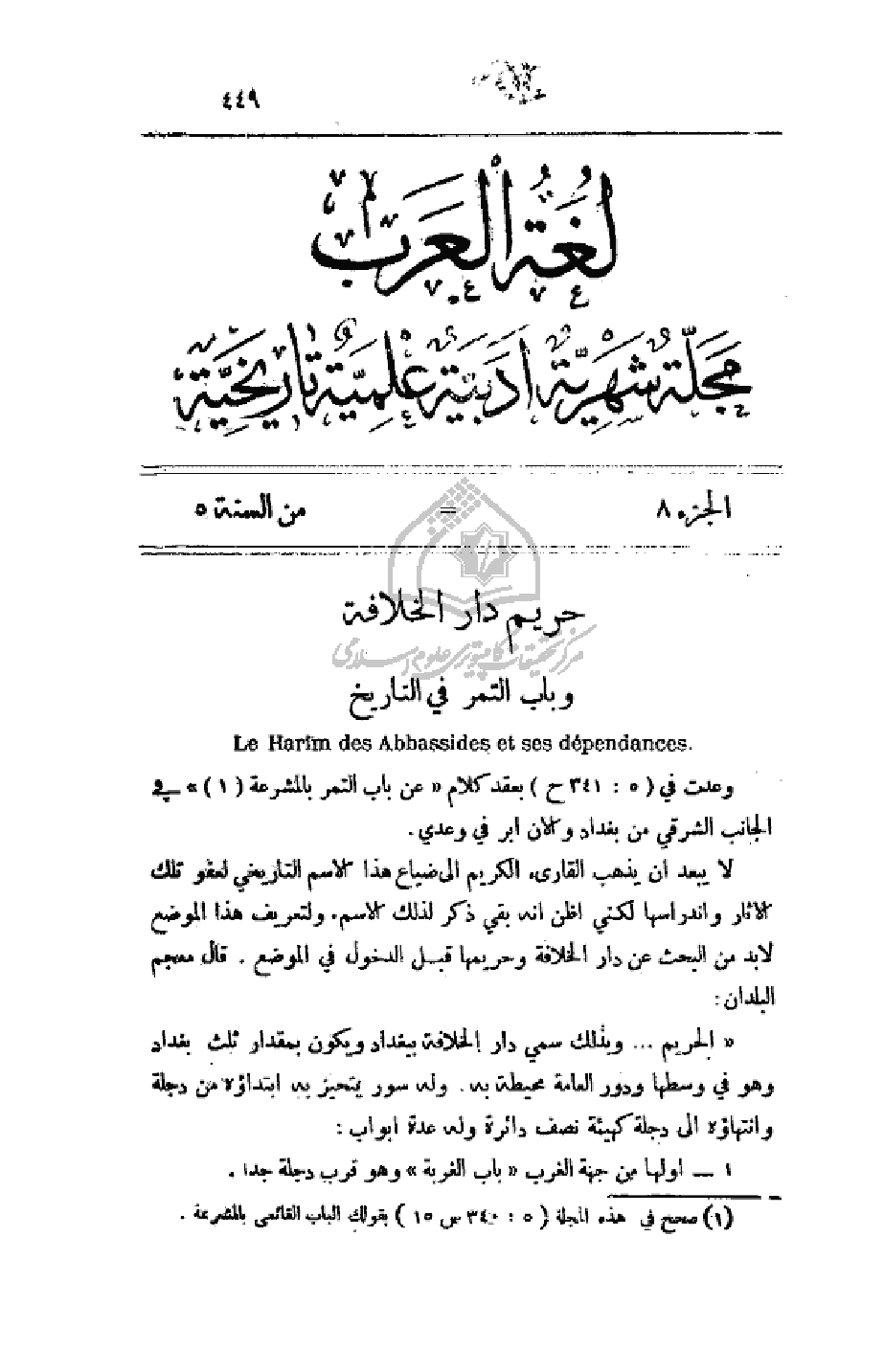 (الحريم. . . وبذلك سمي دار الخلافة ببغداد ويكون بمقدار ثلث بغداد وهو في وسطها ودور العامة محيطة به. وله سور يتحيز به ابتداؤه من دجلة وانتهاؤه إلى دجلة كهيئة نصف دائرة وله عدة أبواب: