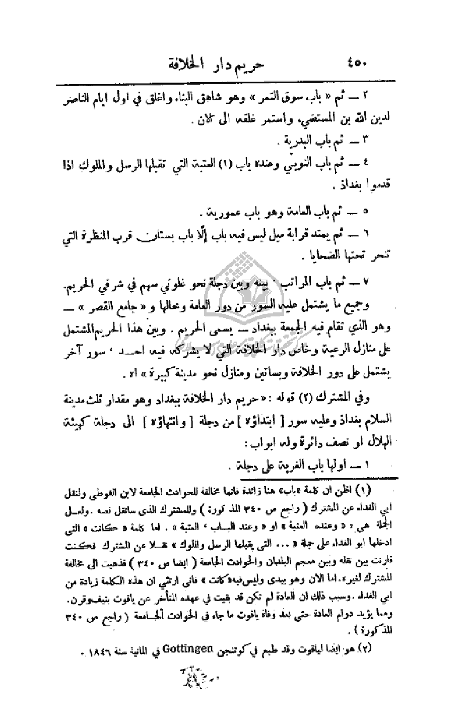 وفي المشترك قوله: (حريم دار الخلافة ببغداد وهو مقدار ثلث مدينة السلام بغداد وعليه سور (ابتداؤه) من دجلة (وانتهاؤه) إلى دجلة كهيئة الهلال أو نصف دائرة وله أبواب: