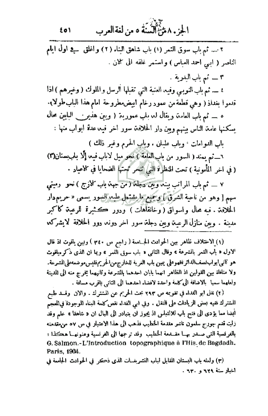 7 - ثم باب المراتب بينه وبين دجلة (من جهة باب الازج) نحو رميتي سهم (وهو من ناحية الشرق) وجميع ما يشتمل عليه السور يسمى (حريم دار الخلافة. فيه محال وأسواق (وخانقاهات) ودور كثيرة للرعية كأكبر مدينة. وبين منازل الرعية وبين دجلة سور آخر دونه دور الخلافة لا يشركه