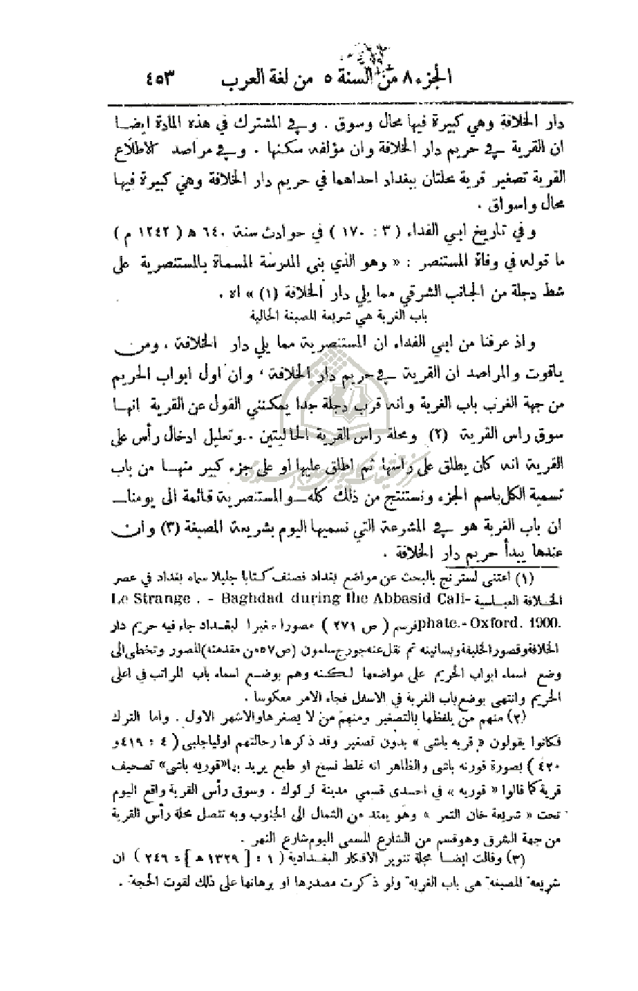 وإذا عرفنا من آبي الفداء أن المستنصرية مما يلي دار الخلافة، ومن ياقوت والمراصد أن القرية في حريم دار الخلافة، وان أول أبواب الحريم من جهة الغرب باب الغربة وانه قرب دجلة جدا يمكنني القول عن القرية أنها سوق راس القرية ومحلة راس القرية الحاليتين. وتعليل إدخال رأس على القرية انه كان يطلق على رأسها ثم أتطلق عليها أو على جزء كبير منها من باب تسمية الكل باسم الجزء ونستنتج من ذلك كله - والمستنصرية قائمة إلى يومنا - أن باب الغربة هو في المشرعة التي نسميها اليوم بشريعة المصبغة وان عندها يبدأ حريم دار الخلافة.