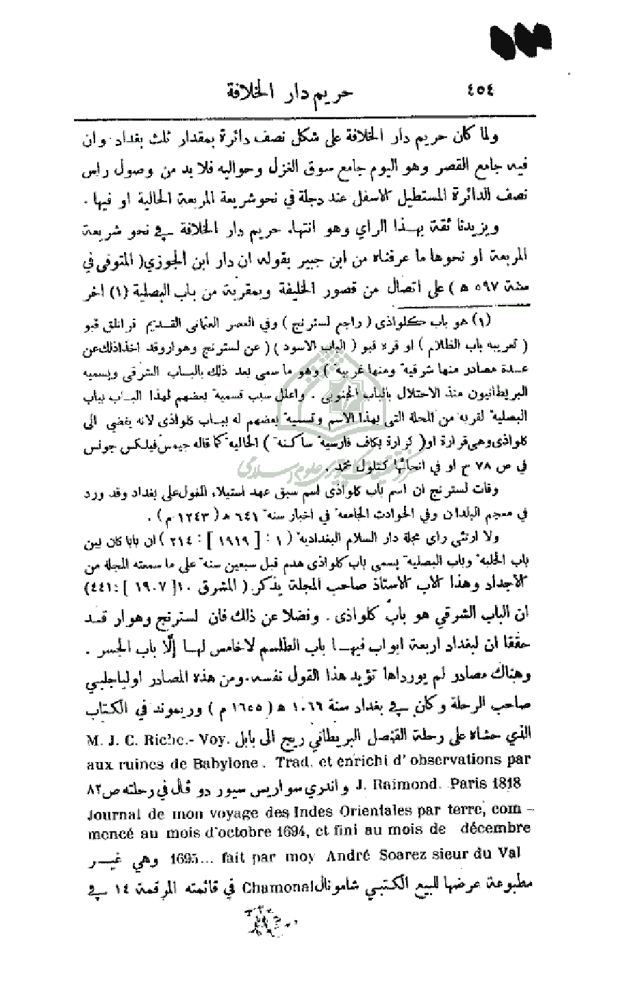 ويزيدنا ثقة بهذا الرأي وهو انتهاء حريم دار الخلافة في نحو شريعة المربعة أو نحوها ما عرفناه من ابن جبير بقوله أن دار ابن الجوزي (المتوفي في سنة 597هـ) على اتصال من قصور الخليفة وبمقربة من باب البصيلة آخر