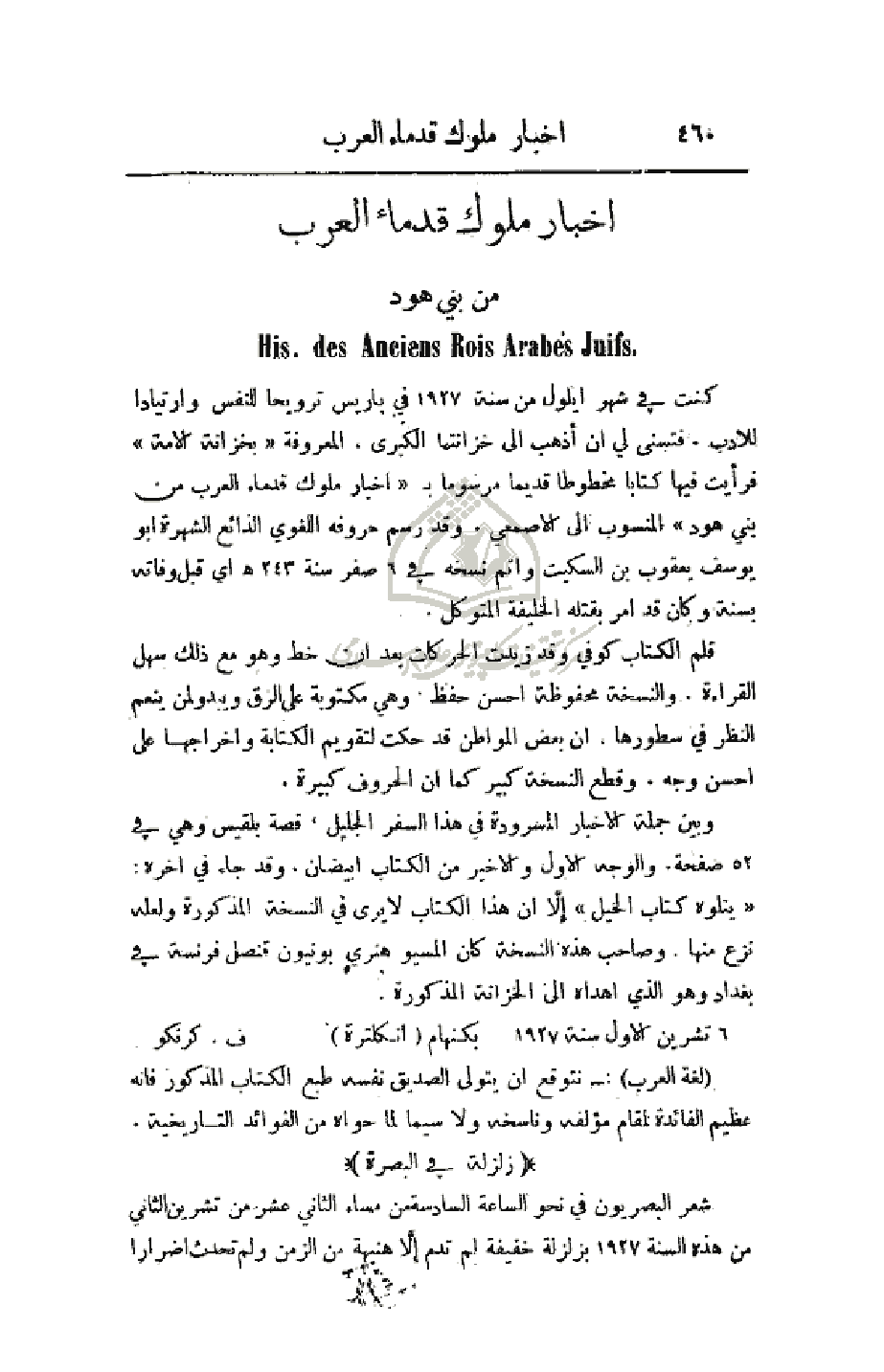 كنت في شهر أيلول من سنة 1927 في باريس ترويحا للنفس وارتيادا للأدب. فتسنى لي أن أذهب إلى خزانتها الكبرى. المعروفة (بخزانة الأمة) فرأيت فيها كتابا مخطوطا قديما مرسوما ب (أخبار ملوك قدماء العرب من بني هود) المنسوب إلى الأصمعي. وقد رسم حروفه اللغوي الذائع الشهرة أبو يوسف يعقوب بن السكيت وأتم نسخه في 6 صفر سنة 243هـ أي قبل وفاته بسنة وكان قد أمر بقتله الخليفة المتوكل.