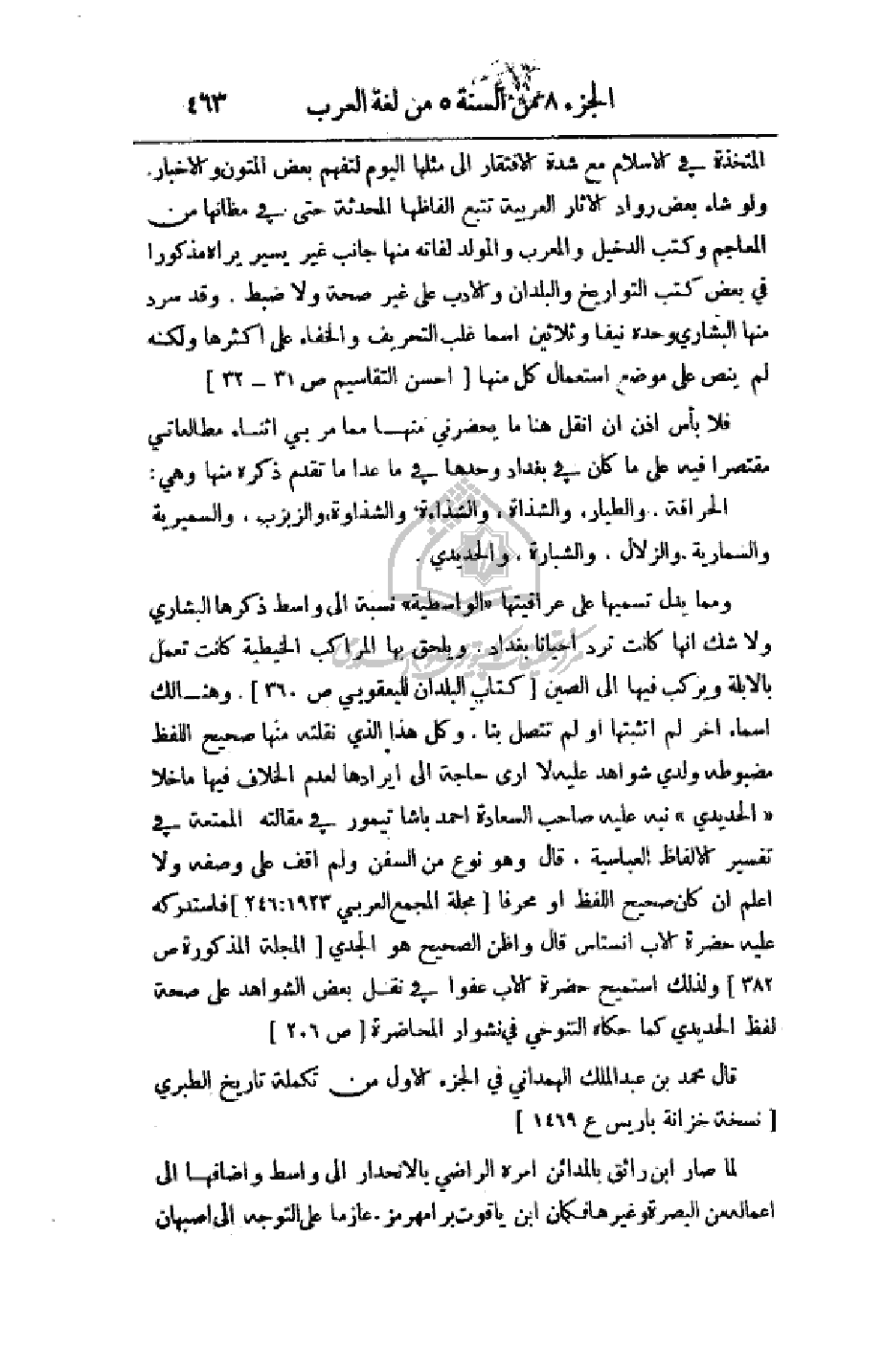 ومما يدل تسميها على عراقيتها (الواسطية) نسبة إلى واسط ذكرها البشاري ولاشك إنها كانت ترد أحيانا بغداد. ويلحق بها المراكب الخيطية كانت تعمل بالابلة ويركب فيها إلى الصين (كتاب البلدان لليعقوبي ص360). وهنالك أسماء آخر لم أتثبتها أو لم تتصل بنا. وكل هذا الذي نقلته منها صحيح اللفظ مضبوطه ولدي شواهد عليه لا أرى حاجة إلى إيرادها لعدم الخلاف فيها ما خلا (الحديدي) نبه عليه صاحب السعادة احمد باشا تيمور في مقالته الممتعة في تفسير الألفاظ العباسية. قال وهو نوع من السفن ولم اقف على وصفه ولا اعلم أن كان صحيح اللفظ أو محرفا (مجلة المجمع العربي 246: 1923) فاستدركه عليه حضرة الأب انستاس قال وأظن الصحيح هو الجدي (المجلة المذكورة ص382) ولذلك استميح حضرة الأب عفوا في نقل بعض الشواهد على صحة لفظ الحديدي كما حكاه التنوخي في نشوار المحاضرة (ص206)