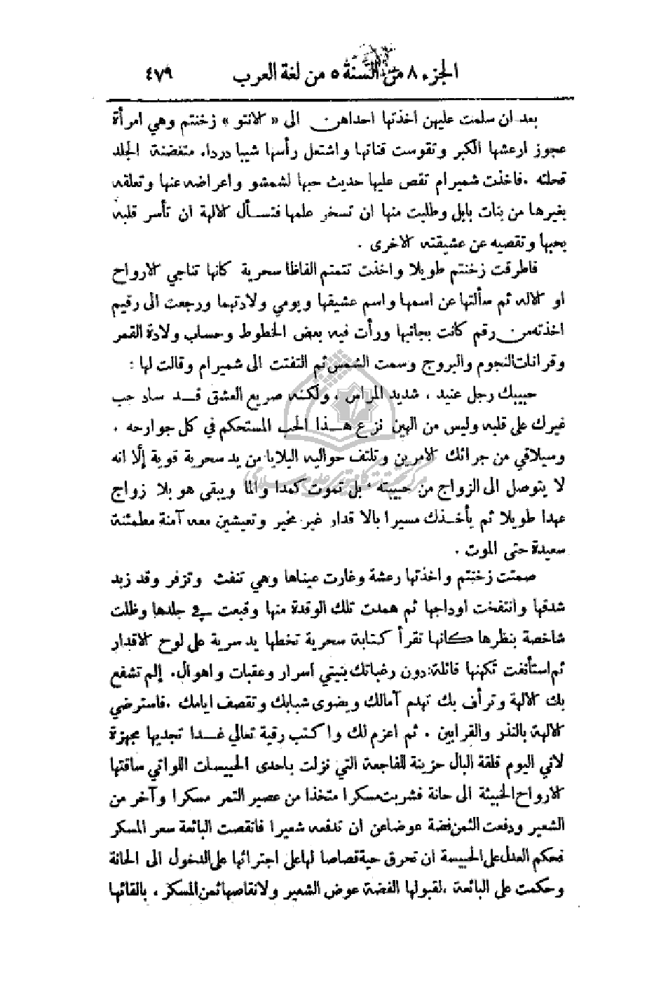 فأطرقت زخنتم طويلا وأخذت تتمتم ألفاظا سحرية كأنها تناجي الأرواح أو الإله ثم سألتها عن اسمها واسم عشيقها ويومي ولادتهما ورجعت إلى رقيم أخذته من رقم كانت بجانبها ورأت فيه بعض الخطوط وحساب ولادة القمر وقرانات النجوم والبروج وسمت الشمس ثم التفتت إلى شميرام وقالت لها: