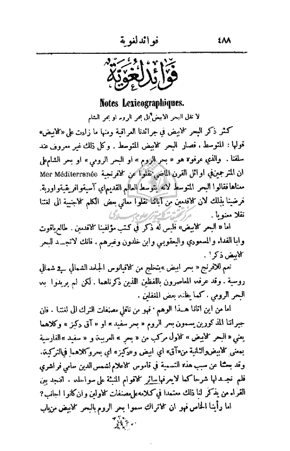 كثر ذكر البحر الأبيض في جرائدنا العراقية ومنها ما زادت على (الأبيض) قولها: المتوسط، فصار البحر الأبيض المتوسط. وكل ذلك غير معروف عند سلفنا. والذي عرفوه هو (بحر الروم) أو (البحر الرومي) أو بحر الشام على أن المترجمين في أوائل القرن الماضي، نقلوا عن الإفرنجية معناها فقالوا البحر المتوسط لأنه يتوسط العالم القديم أي آسية وأفريقية وأوربة. فرضينا بذلك لان الأقدمين من آبائنا نقلوا معاني بعض الكلم الأجنبية إلى لغتنا نقلا معنويا.