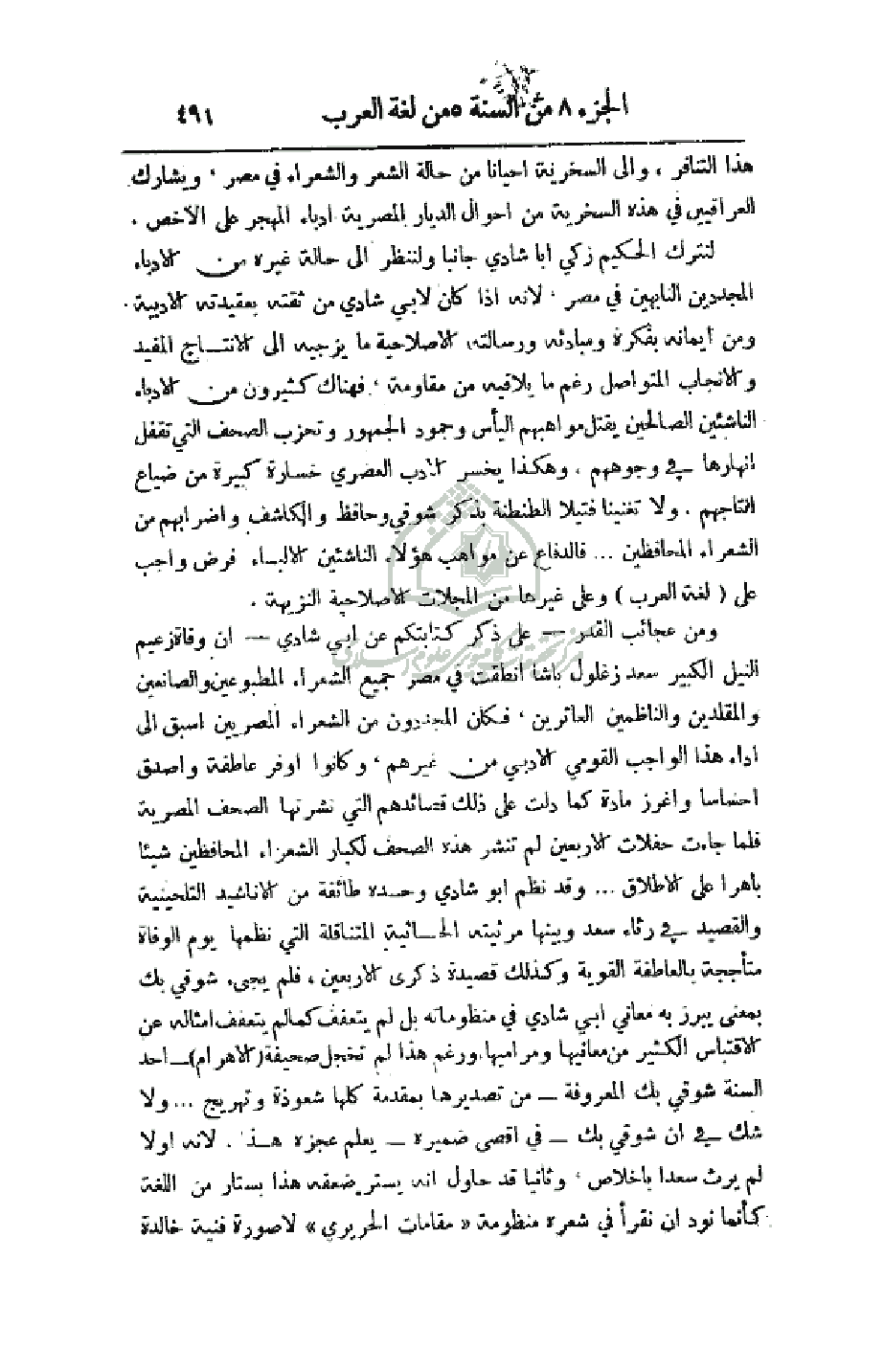 ومن عجائب القدر - على ذكر كتابتكم عن أبي شادي - أن وفاة زعيم النيل الكبير سعد زغلول باشا أنطقت في مصر جميع الشعراء المطبوعين والصانعين والمقلدين والناظمين العاثرين، فكان المجددون من الشعراء المصريين اسبق إلى أداء هذا الواجب القومي الأدبي من غيرهم، وكانوا أوفر عاطفة واصدق إحساسا واغرز مادة كما دلت على ذلك قصائدهم التي نشرتها الصحف المصرية فلما جاءت حفلات الأربعين لم تنشر هذه الصحف لكبار الشعراء المحافظين شيئا باهرا على الإطلاق. . . وقد نظم أبو شادي وحده طائفة من الأناشيد التلحينية والقصيد في رثاء سعد وبينها مرثيته الحائية المتناقلة التي نظمها يوم الوفاة متأججة بالعاطفة القوية وكذلك قصيدة ذكرى الأربعين، فلم يجيء شوقي بك بمعنى يبرز به معاني أبي شادي في منظوماته بل لم يتعفف كما لم يتعفف أمثاله عن الاقتباس الكثير من معانيها ومراميها، ورغم هذا لم تخجل صحيفة (الأهرام) - أحد السنة شوقي بك المعروفة - من تصديرها بمقدمة كلها شعوذة وتهريج. . . ولا شك في أن شوقي بك - في أقصى ضميره - يعلم عجزه هذا، لأنه أولا لم يرث سعدا باخلاص، وثانيا قد حاول انه يستر ضعفه هذا بستار من اللغة كأنما نود أن نقرأ في شعره منظومة (مقامات الحريري) لا صورة فنية خالدة
